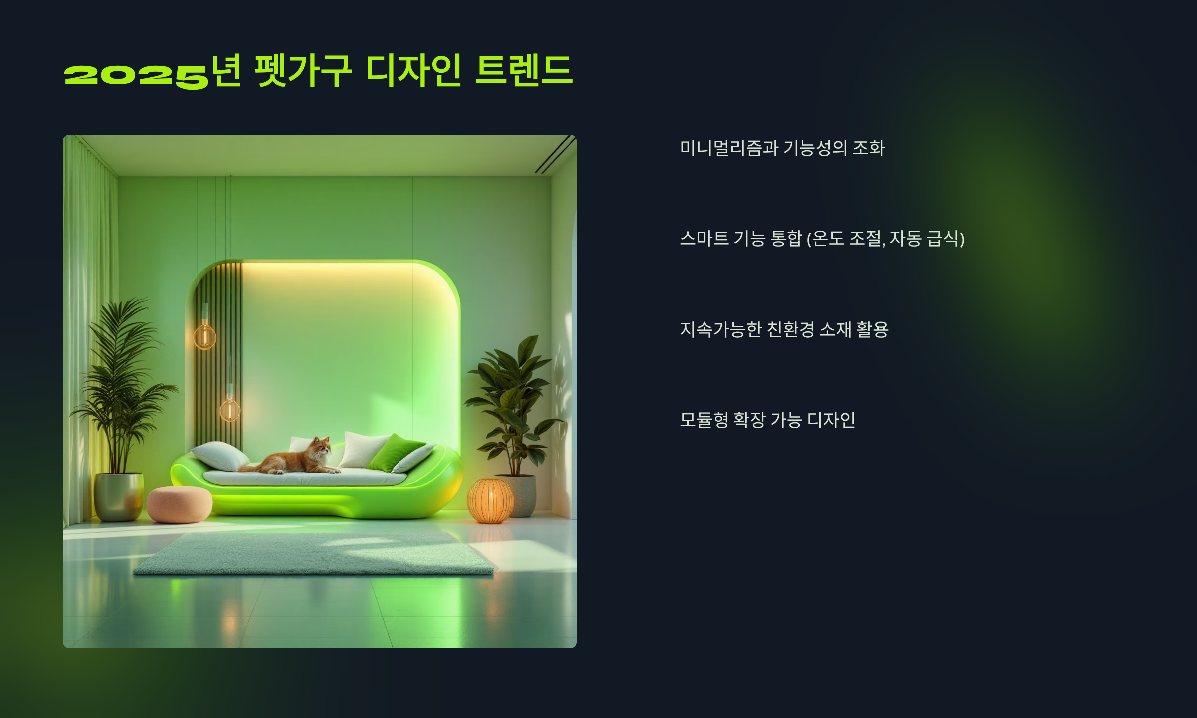 | 모던 미니멀 | 직선적 디자인, 모노톤, 기능성 강조 | 큐브형 하우스, 슬림 캣타워 |