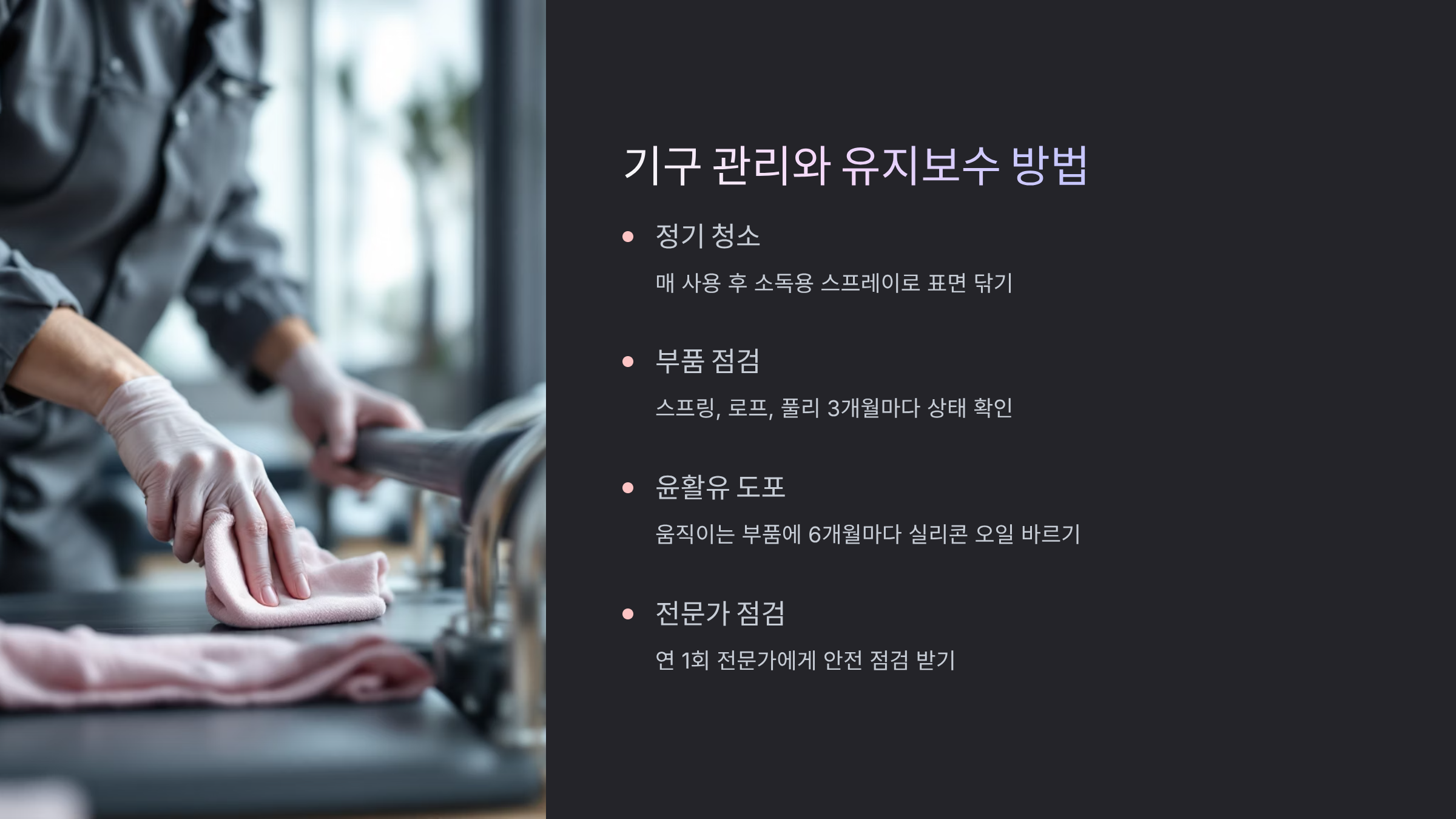 필라테스 기구는 정기적인 관리가 수명을 좌우해요. 리포머의 경우 매주 레일을 청소하고 윤활제를 발라주면 부드러운 움직임을 유지할 수 있어요. 실리콘 스프레이나 전용 윤활제를 사용하세요. WD-40 같은 일반 윤활제는 고무 부품을 손상시킬 수 있으니 피해야 해요.