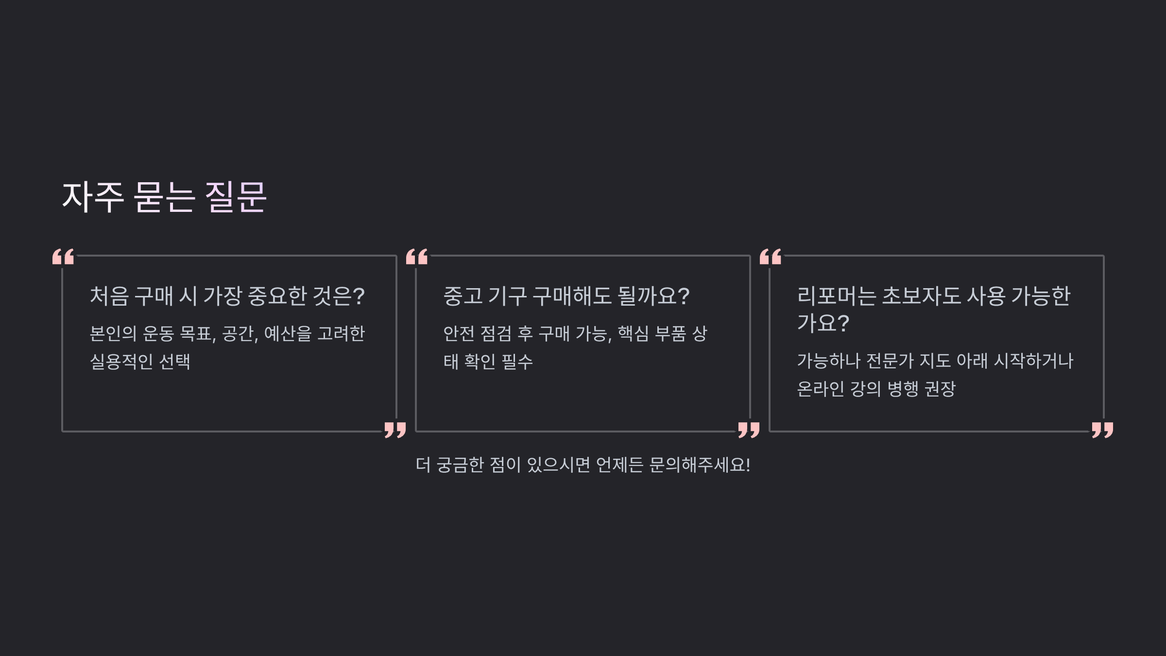 A8. 본인의 목적과 환경에 맞는 선택이 가장 중요해요! 운동 목적(다이어트, 재활, 체형 교정 등), 공간 크기, 예산, 운동 경험 등을 종합적으로 고려해야 해요. 무작정 비싼 제품보다는 꾸준히 사용할 수 있는 제품을 선택하는 것이 현명해요. 가능하면 직접 체험해 보고, A/S와 부품 수급이 원활한 브랜드를 선택하세요! 🎯