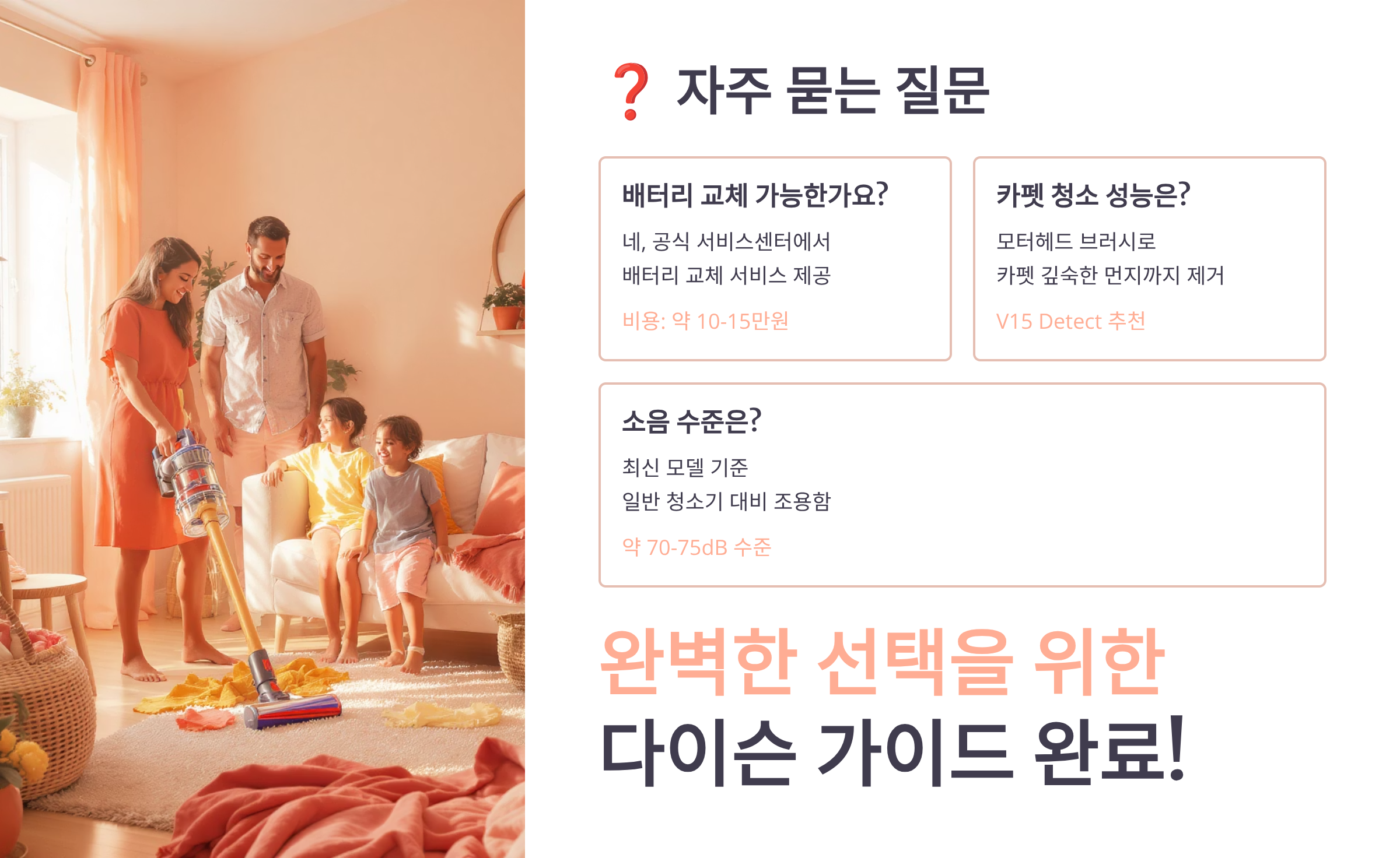 본 글은 2025년 1월 기준으로 작성된 정보성 콘텐츠입니다. 제품 사양과 가격은 변동될 수 있으며, 구매 결정은 개인의 판단에 따라 이루어져야 합니다. 작성자는 제품 구매로 인한 어떠한 책임도 지지 않으며, 최신 정보는 다이슨 공식 홈페이지에서 확인하시기 바랍니다.