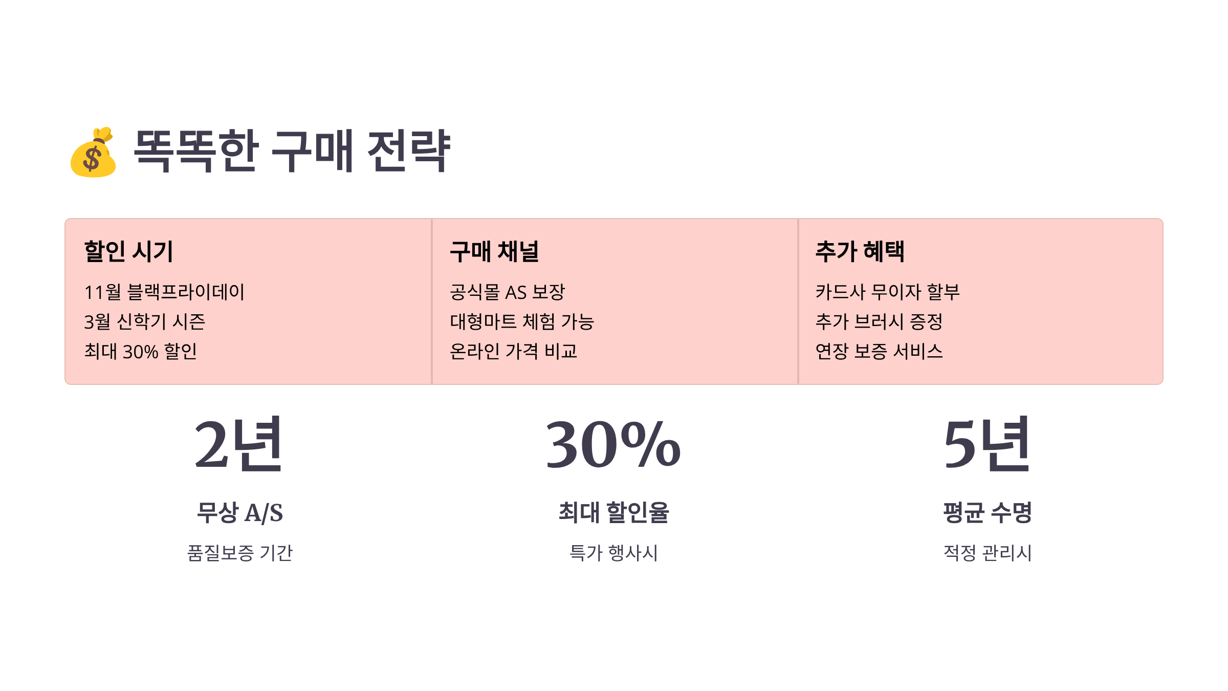 | 백화점 | 직접 체험, 카드 할인 | 모델 제한적 | 체험 구매형 |