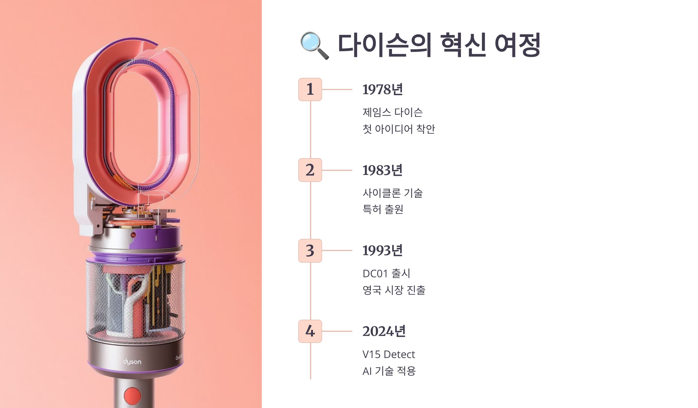 다이슨 청소기는 1993년 제임스 다이슨이 개발한 혁신적인 사이클론 기술로 시작되었어요. 기존 청소기의 먼지봉투 문제를 해결하고자 5년간 5,127개의 프로토타입을 만들며 완성한 결과물이 바로 오늘날 우리가 사용하는 다이슨 청소기의 시초가 되었답니다. 🌟