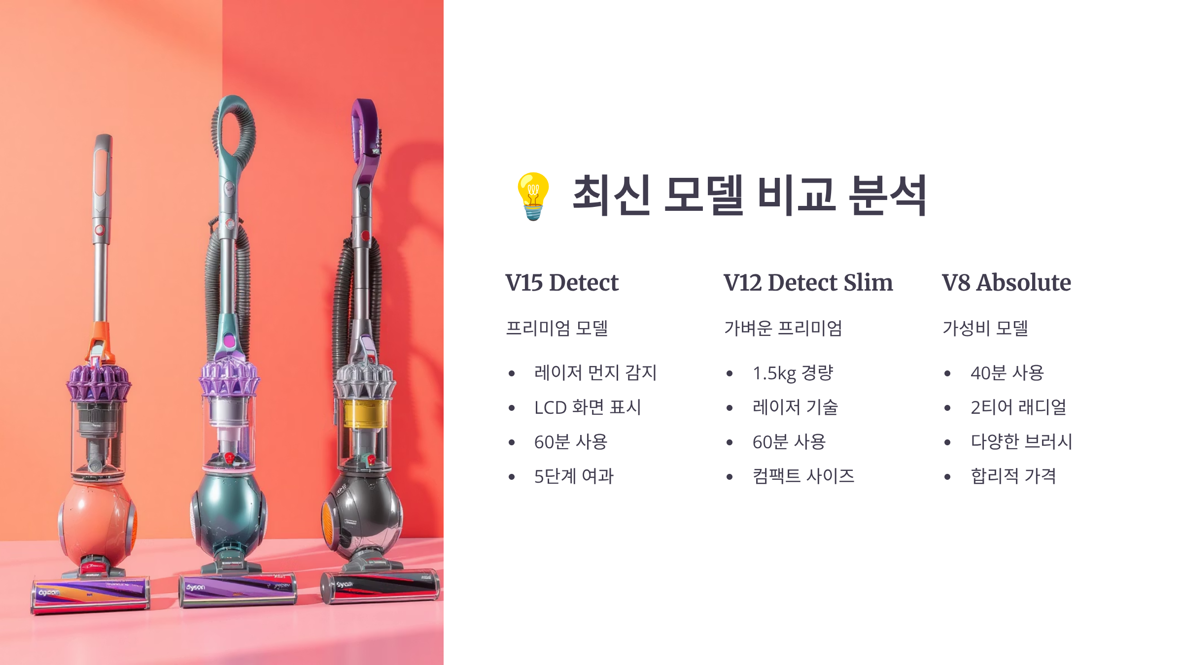 2025년 현재 다이슨의 주력 모델은 V15 디텍트, V12 디텍트 슬림, V11, V10, 그리고 옴니 글라이드가 있어요. 각 모델마다 타겟층과 특화 기능이 다르기 때문에 자신의 니즈를 정확히 파악하는 것이 중요하답니다. V15 디텍트는 최고 사양 모델로 레이저 먼지 감지와 피에조 센서가 탑재되어 있고, V12는 가벼운 무게로 여성분들에게 인기가 많아요.