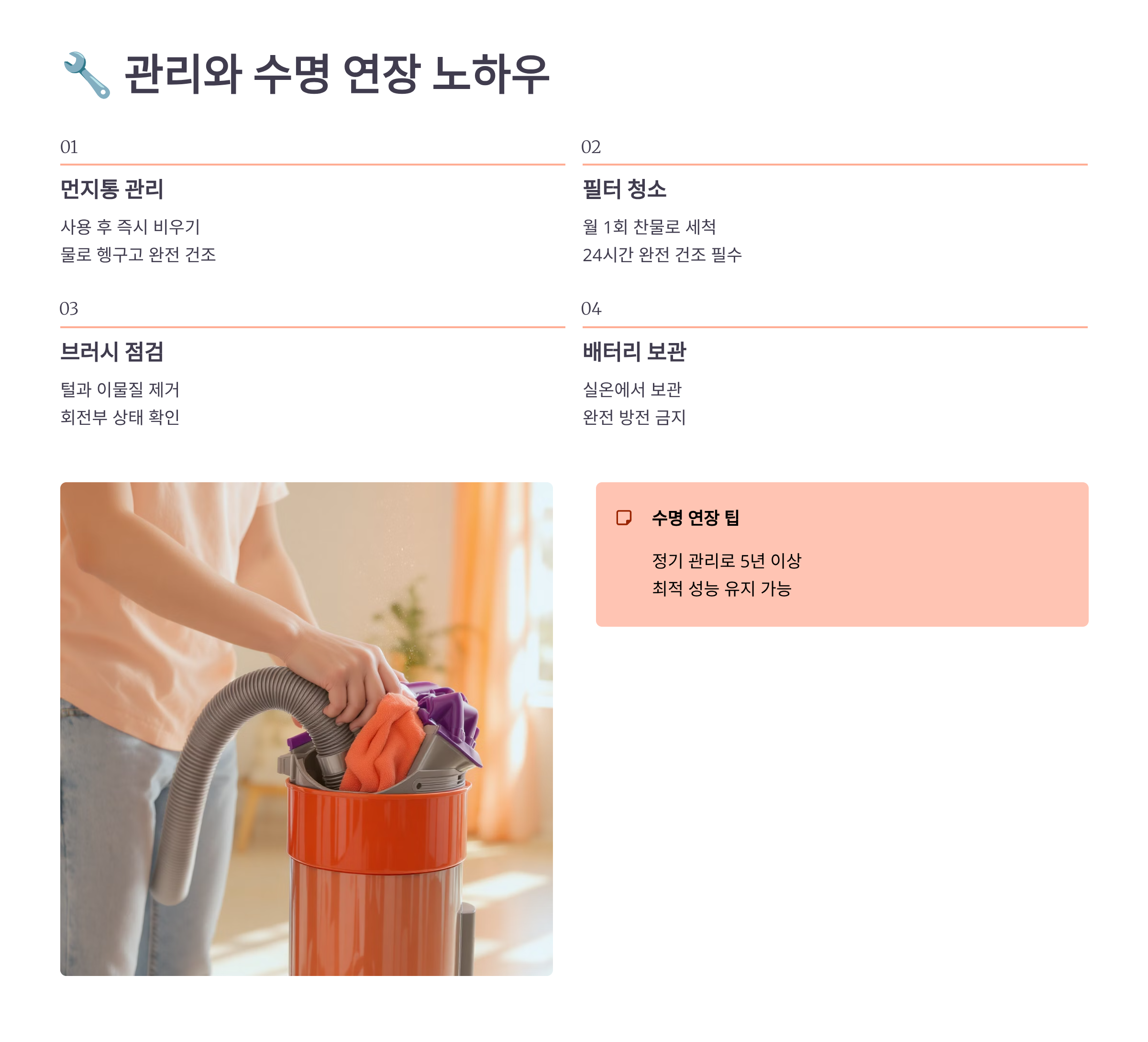 다이슨 청소기를 오래 사용하려면 정기적인 관리가 필수예요. 가장 중요한 것은 필터 청소인데, 한 달에 한 번은 찬물로 깨끗이 씻어주는 것이 좋아요. 뜨거운 물이나 세제는 필터를 손상시킬 수 있으니 주의하세요. 세척 후에는 정말히 건조해야 하는데, 최소 24시간은 자연 건조해야 해요. 젖은 상태로 사용하면 모터가 손상될 수 있답니다.