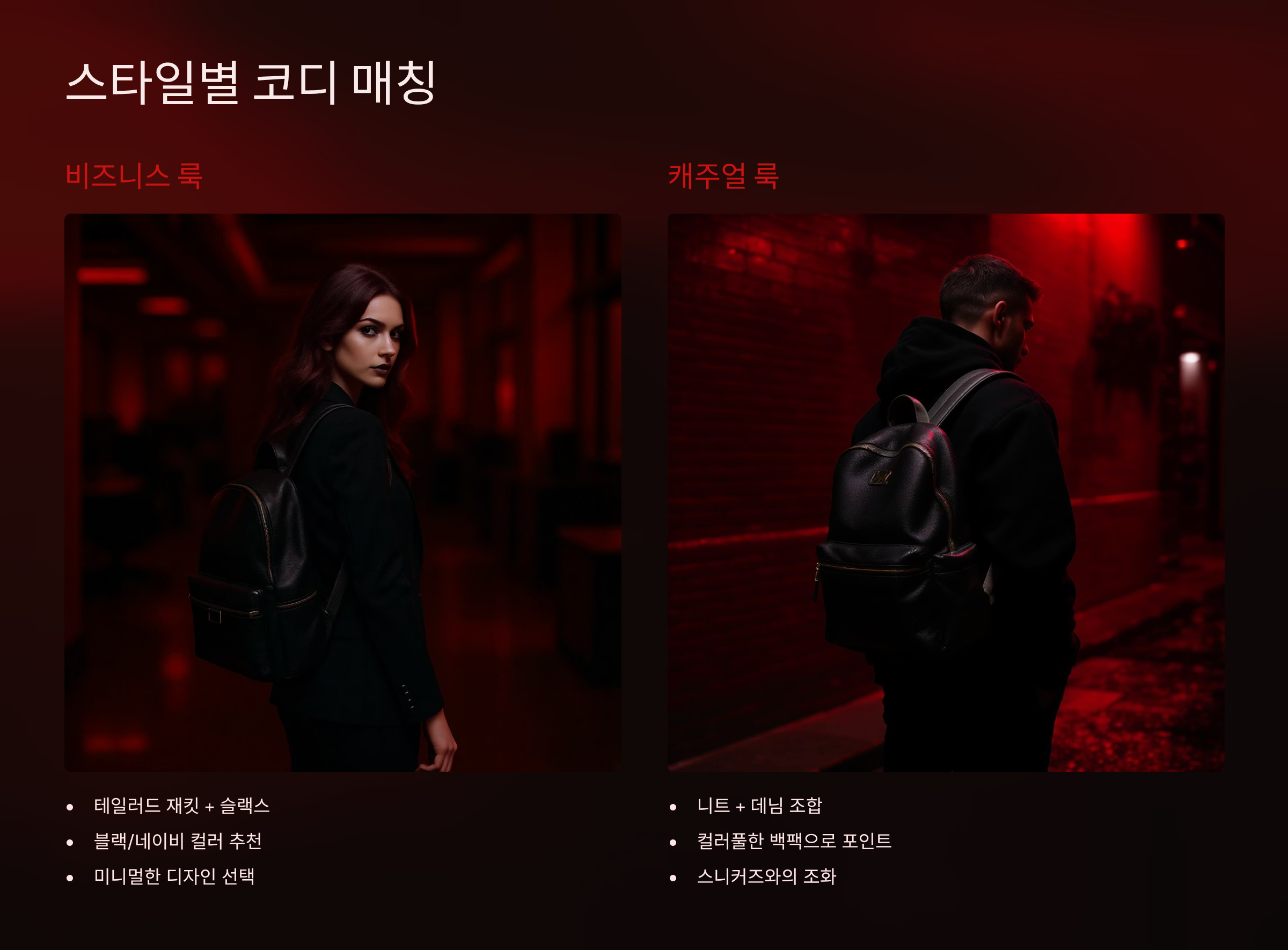 컬러 매칭도 중요한 포인트예요. 톤온톤 매칭으로 통일감을 주거나, 반대로 컬러 블로킹으로 포인트를 줄 수 있어요. 올블랙 룩에 레드 백팩을 매치하면 시선을 사로잡는 룩이 완성되고, 베이지톤 의상에 브라운 백팩을 매치하면 고급스러운 느낌을 연출할 수 있어요. 계절감을 고려한 컬러 선택도 중요해요.