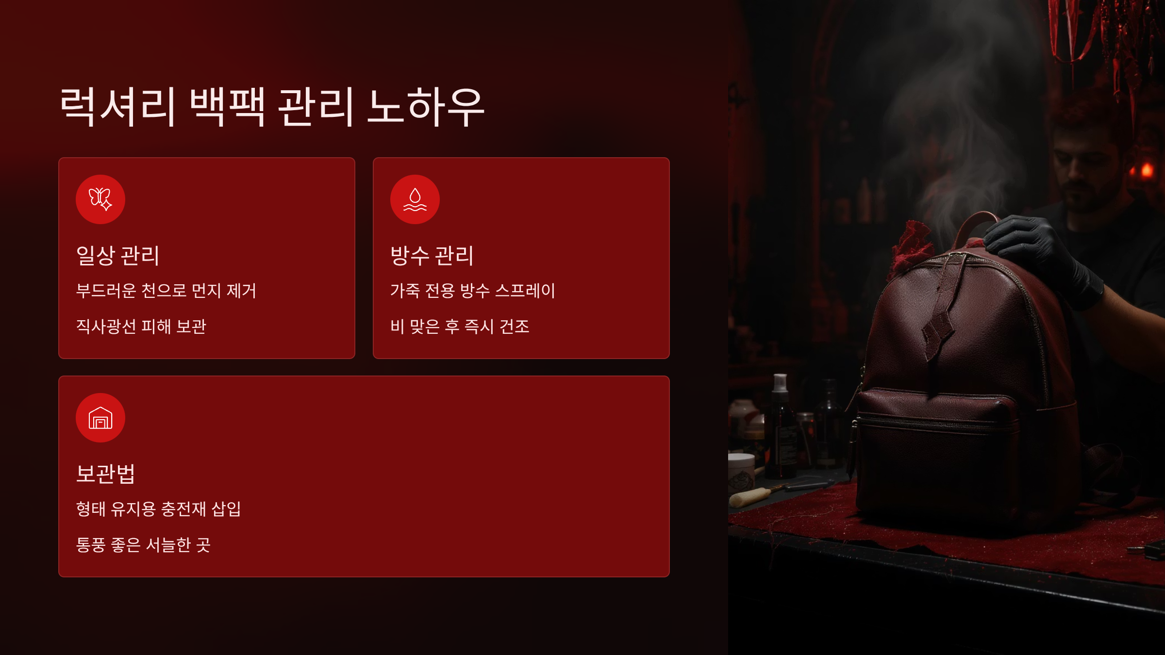 럭셔리 백팩을 오래 사용하려면 올바른 관리가 필수예요. 가죽 백팩의 경우 주기적인 보습이 중요해요. 3-4개월마다 가죽 전용 크림을 발라주면 가죽이 갈라지거나 변색되는 것을 방지할 수 있답니다. 크림을 바를 때는 소량을 부드러운 천에 묻혀 원을 그리듯 문질러주세요. 과도한 양은 오히려 가죽을 상하게 할 수 있어요.