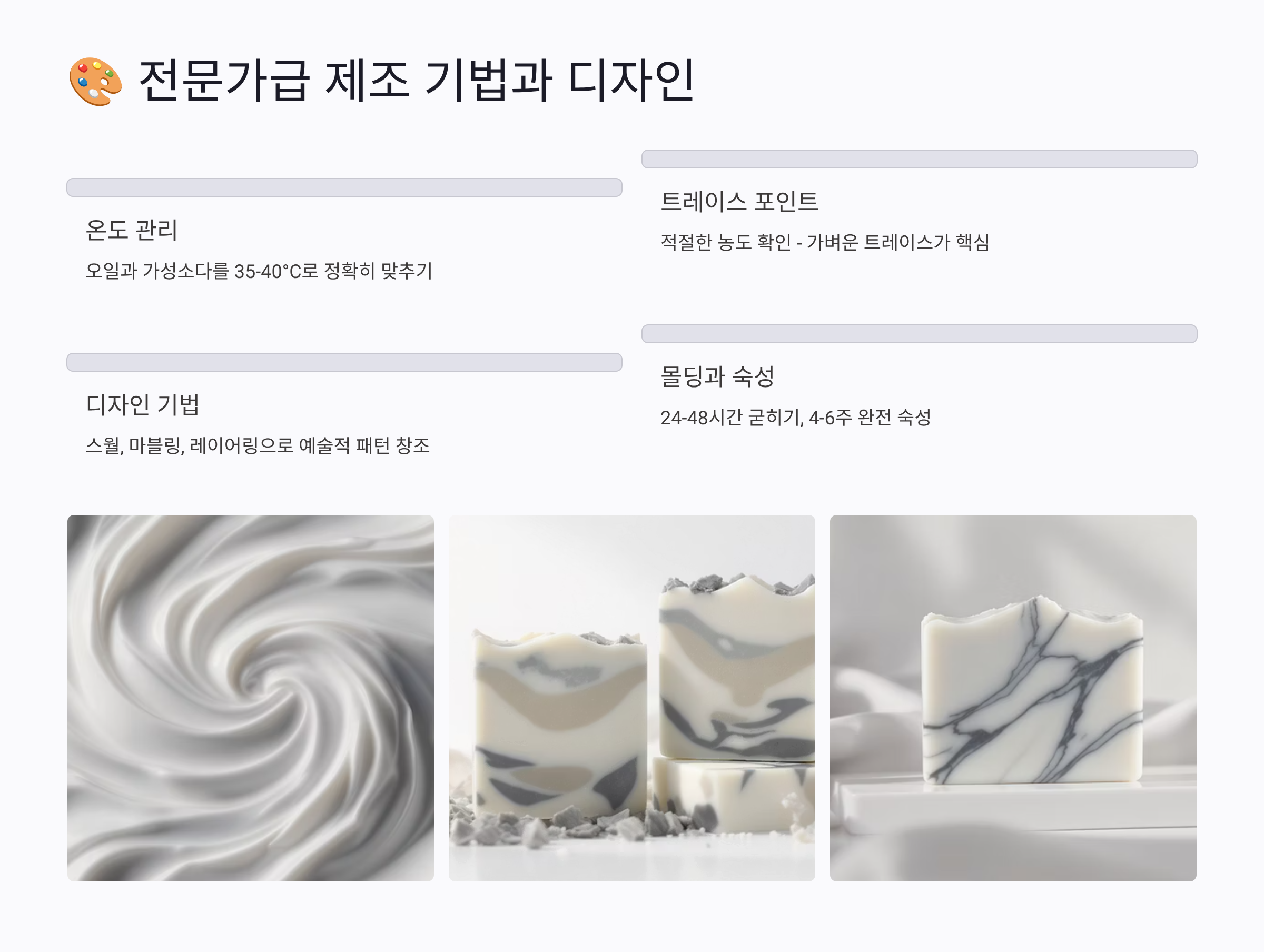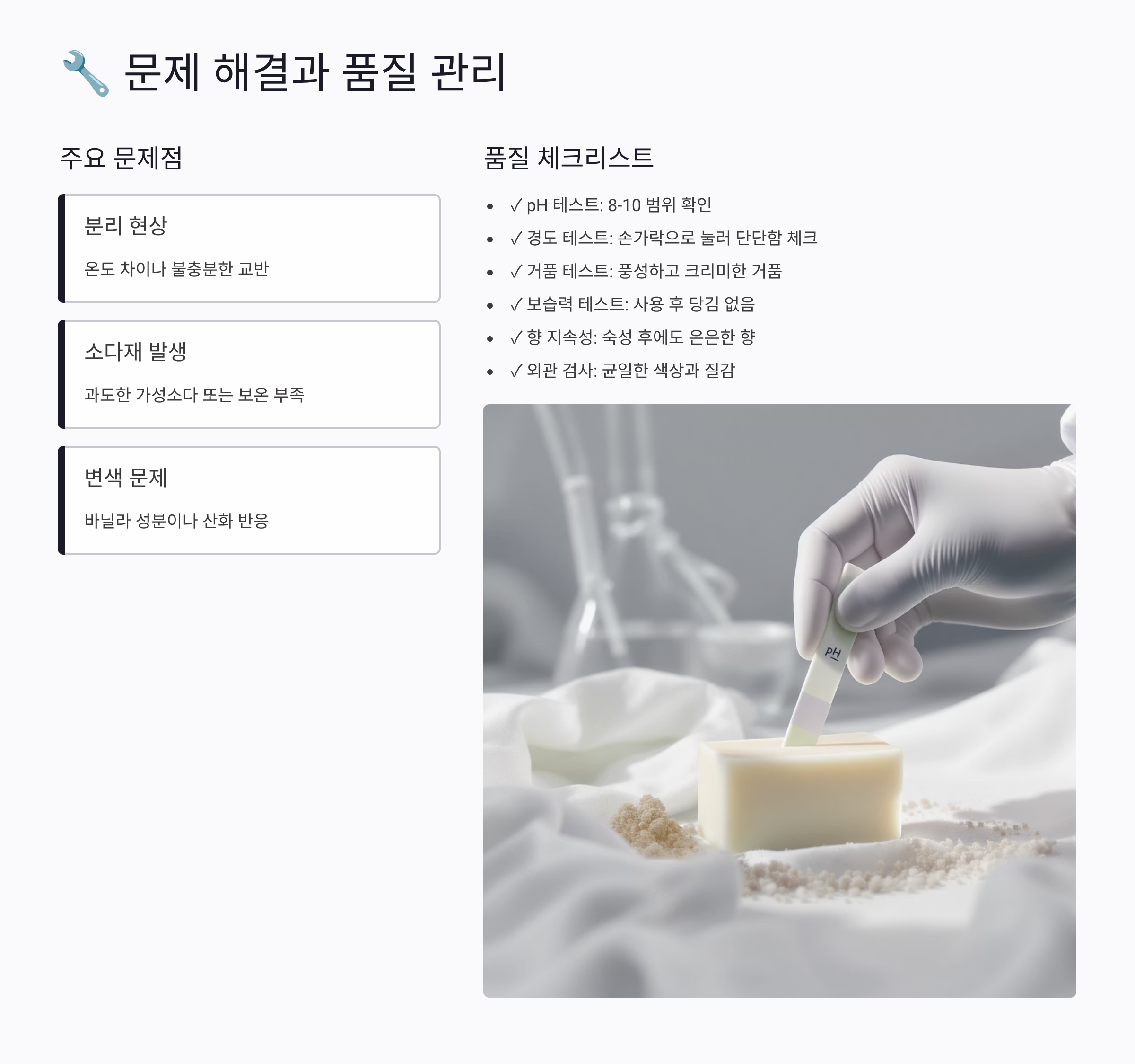 | 비누 갈라짐 | 과열, 급속 건조 | 온도 낮추기, 천천히 건조 |
