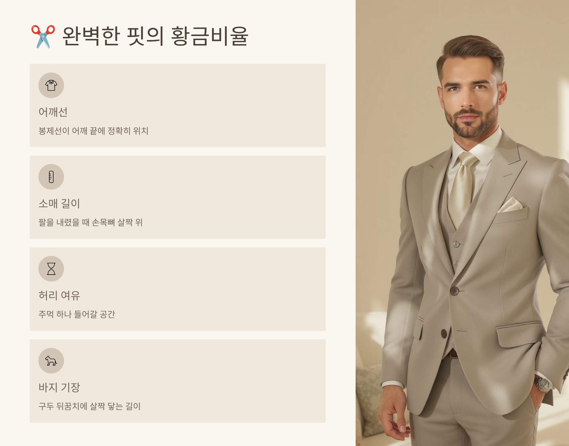 면책조항: 본 글의 정보는 일반적인 가이드라인이며, 개인의 체형과 스타일에 따라 다를 수 있습니다. 전문 테일러와의 상담을 권장합니다.