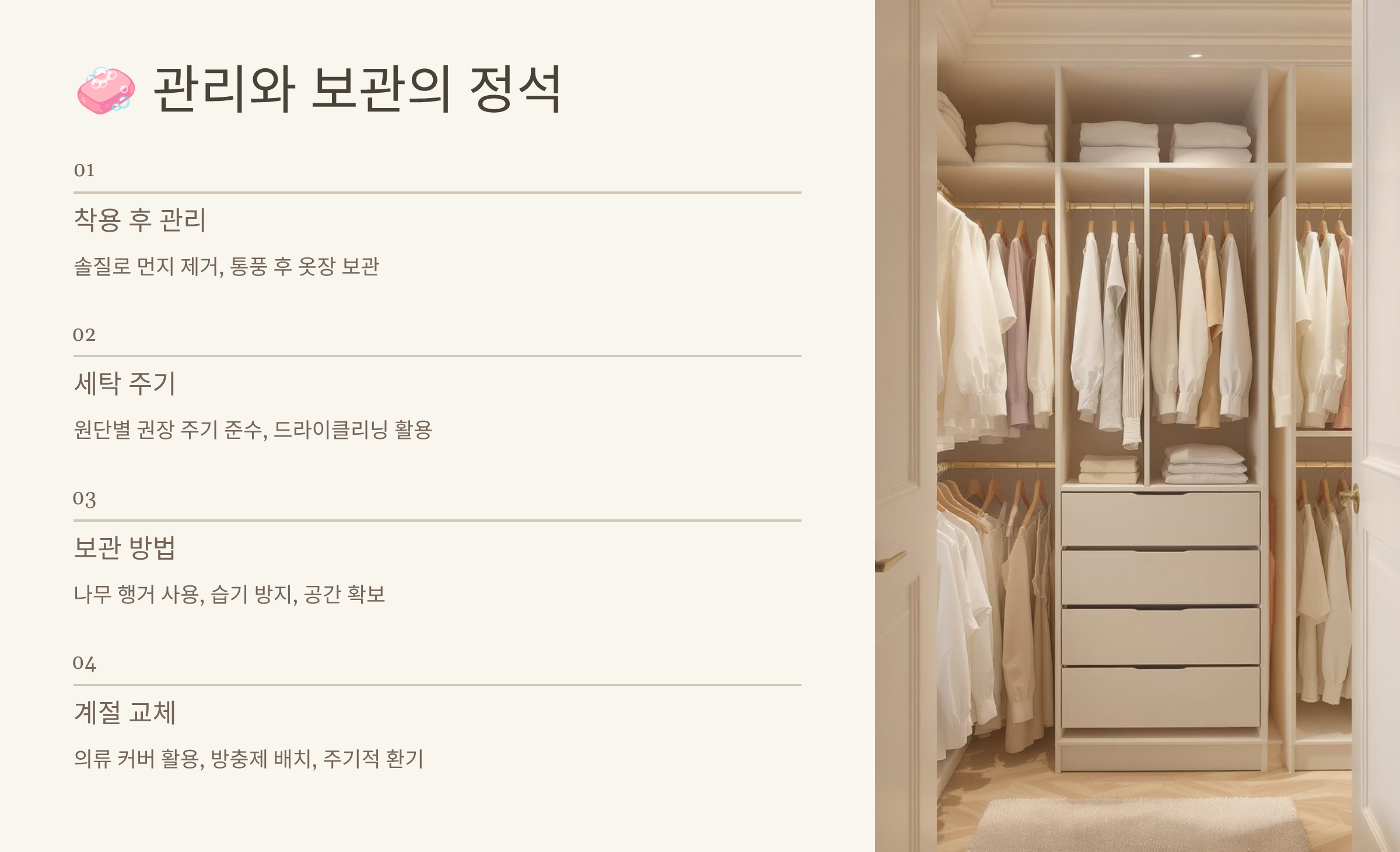 보관 방법도 중요해요. 옷장은 습도 50~60%, 온도 20도 정도가 이상적이에요. 제습제와 방충제를 사용하되, 원단에 직접 닿지 않도록 주의해요. 정장 커버는 부직포나 면 소재를 사용하면 통기성이 좋아요. 비닐 커버는 습기가 차서 곰팡이가 생길 수 있으니 피하세요.