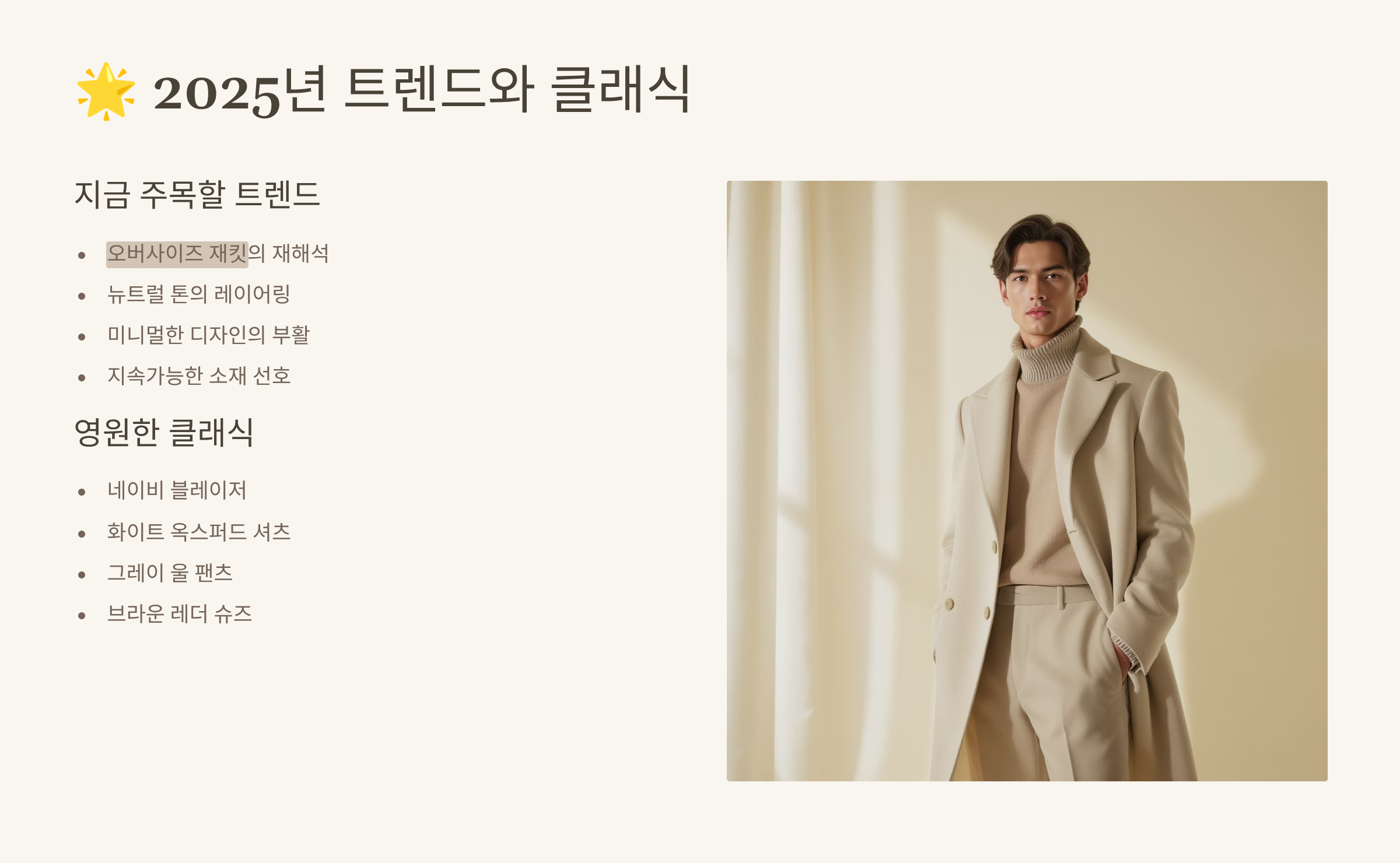 컬러 트렌드는 어스톤이 강세예요. 베이지, 카키, 올리브, 테라코타 같은 자연에서 영감을 받은 색상들이 인기예요. 특히 톤온톤 스타일링이 유행하면서 같은 색상의 다른 채도로 레이어링 하는 방법이 주목받고 있어요. 네이비와 그레이는 여전히 클래식으로 사랑받지만, 좀 더 밝고 경쾌한 톤으로 변화하고 있어요.