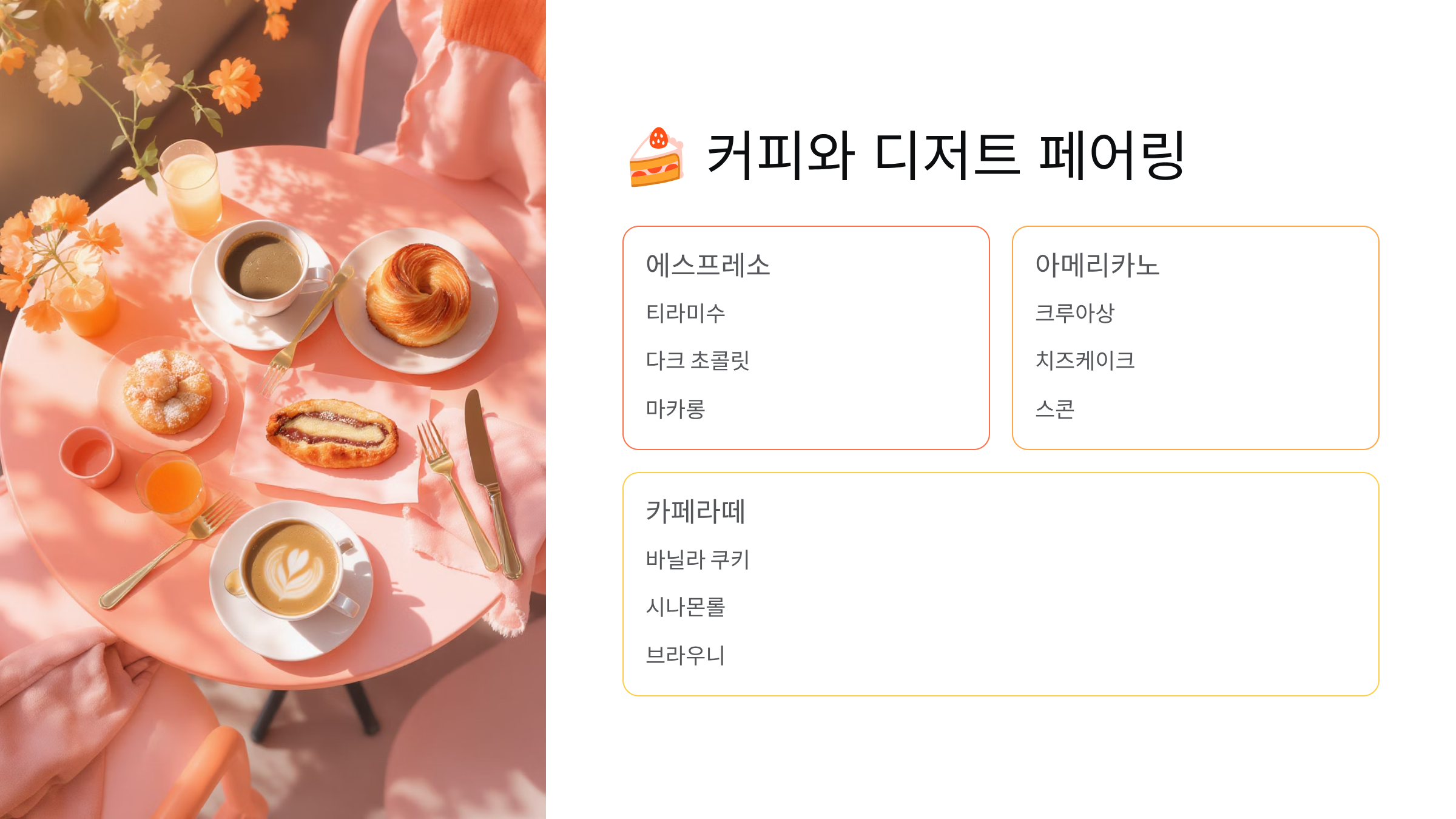 | 커피 종류 | 추천 디저트 | 페어링 포인트 |