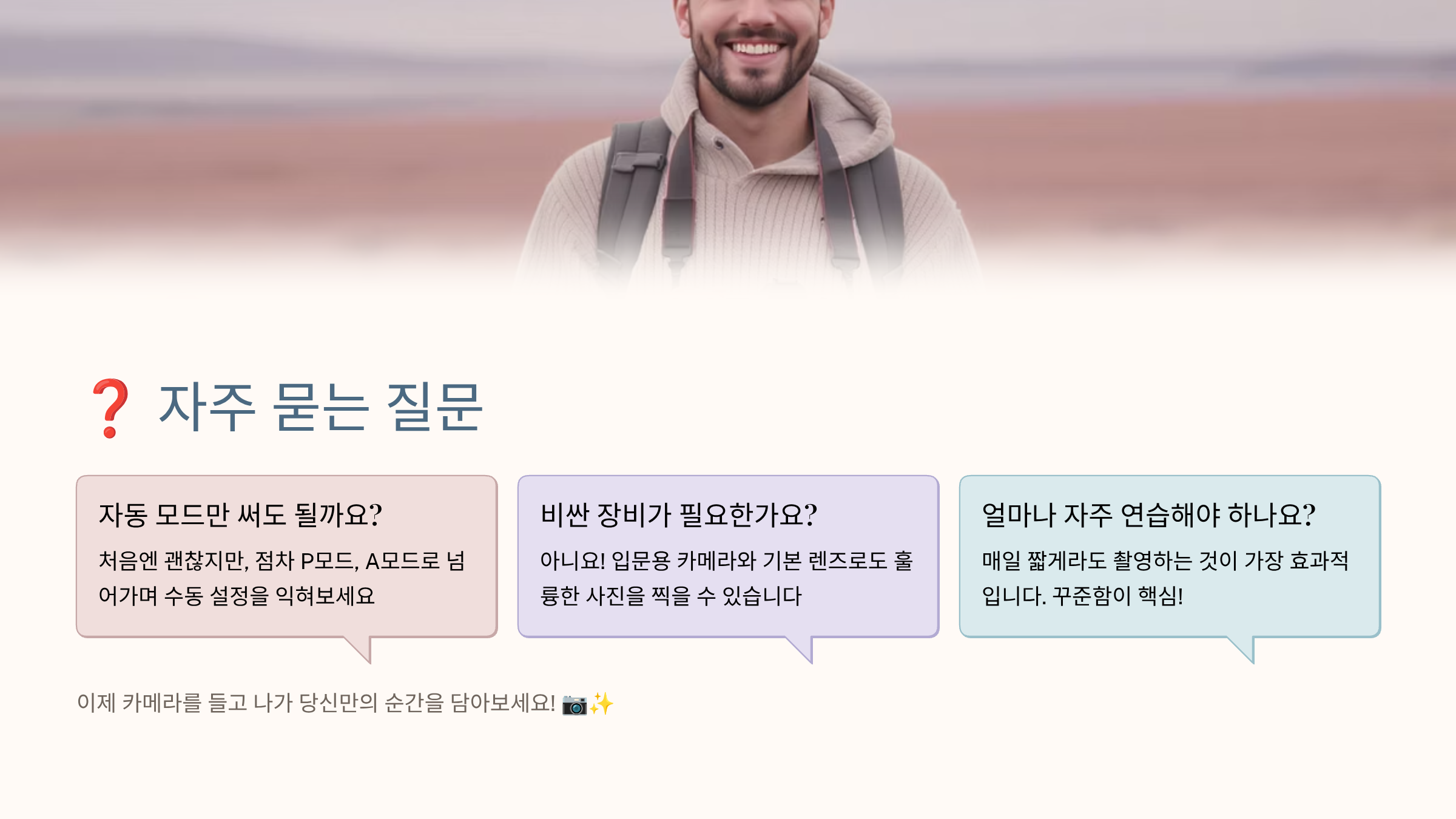 A8. 많이 찍고, 분석하고, 피드백받기예요! 📈 매일 최소 10장씩 찍으면서 카메라와 친해지세요. 마음에 드는 사진을 분석해 보고 똑같이 따라 찍어보는 것도 좋은 연습이에요. SNS나 동호회에서 피드백을 받으면 빠르게 성장할 수 있어요. 유튜브 강좌도 도움이 되지만, 직접 찍어보는 것이 가장 중요해요. 실패를 두려워하지 말고 계속 도전하세요! 1년 후 처음 찍은 사진을 보면 놀라운 발전을 느낄 거예요! ✨