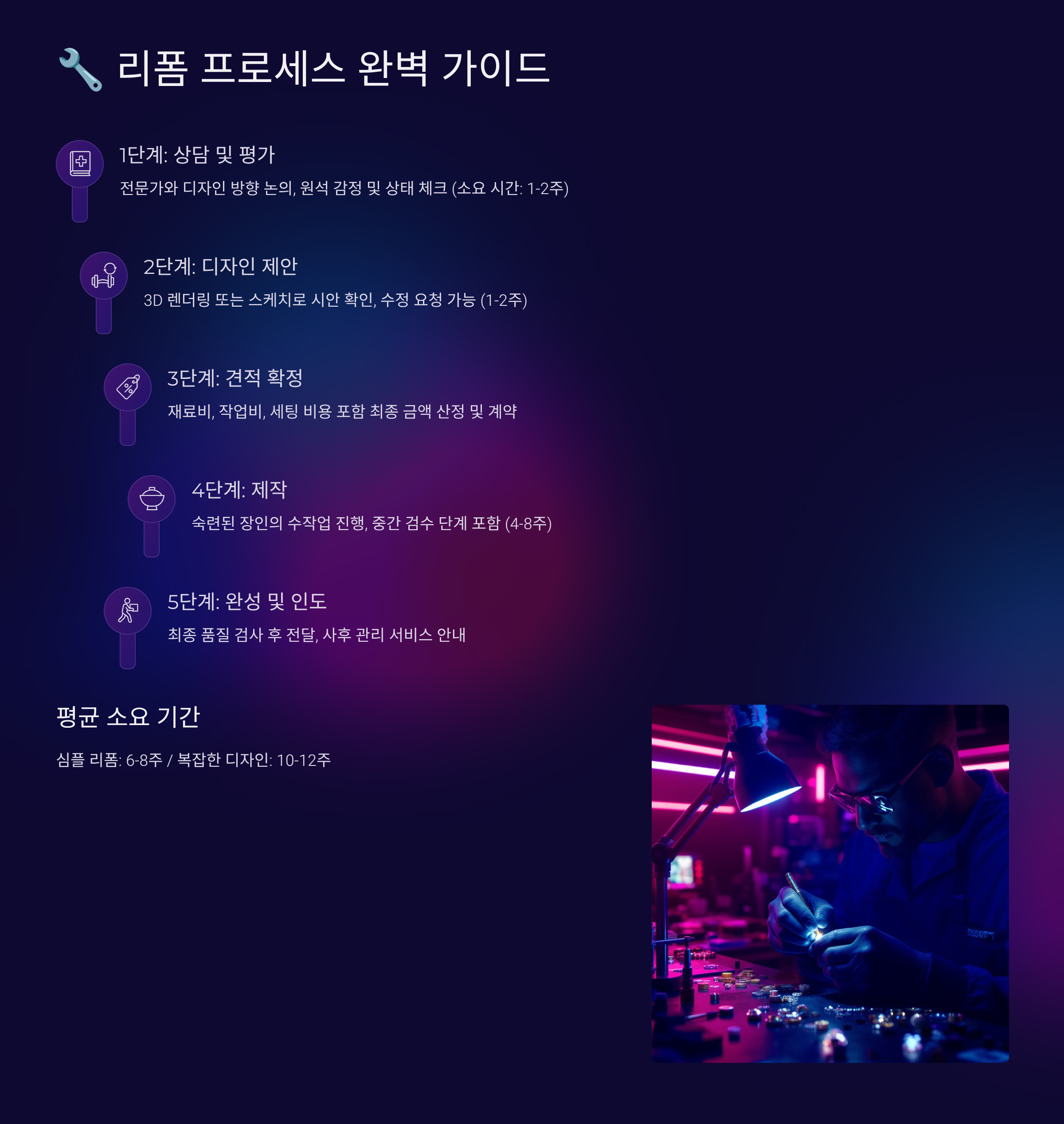 리폼 비용을 절감하는 방법도 있어요. 시즌 오프 기간을 활용하면 20-30% 할인을 받을 수 있고, 여러 개의 주얼리를 한 번에 리폼하면 패키지 할인이 적용돼요. 또한 젊은 신진 디자이너와 협업하면 합리적인 가격에 창의적인 디자인을 얻을 수 있어요. 서울 을지로나 종로 귀금속 거리에서는 숙련된 장인들이 브랜드 대비 50% 저렴한 가격에 고품질 리폼 서비스를 제공한답니다.