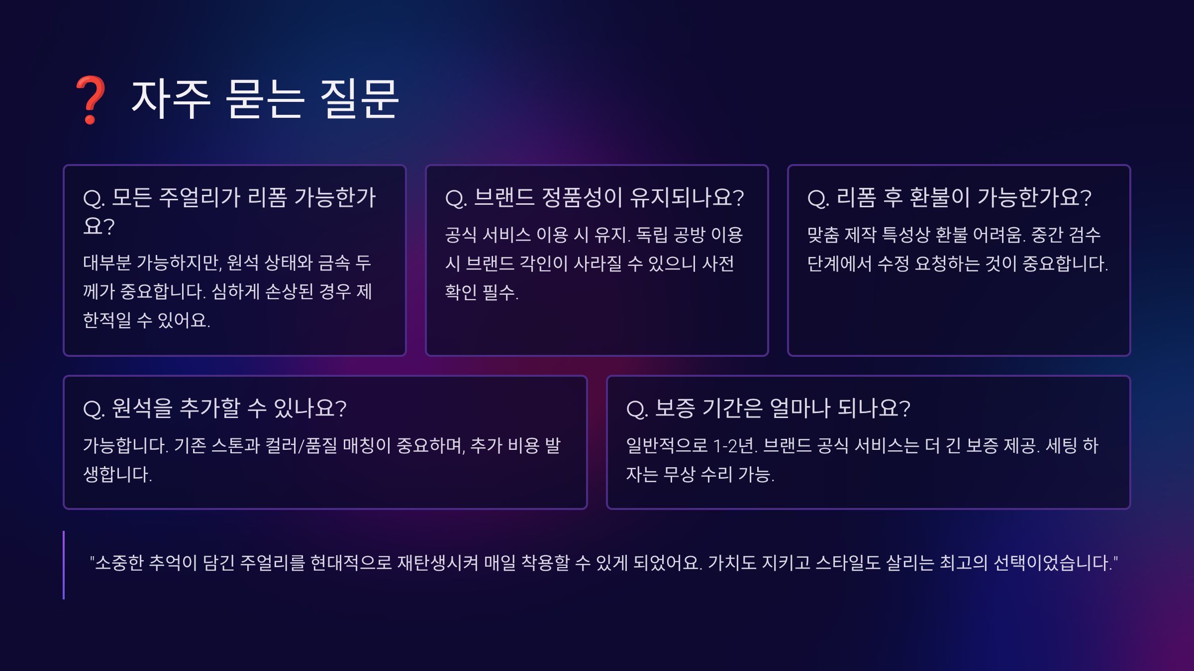본 콘텐츠는 일반적인 정보 제공을 목적으로 작성되었으며, 특정 브랜드나 업체의 서비스를 보증하거나 추천하는 것은 아닙니다. 주얼리 리폼은 개별 제품의 상태와 작업 범위에 따라 결과가 다를 수 있으며, 실제 비용과 작업 기간은 상담을 통해 확인하시기 바랍니다. 리폼 결정 전 반드시 전문가와 충분한 상담을 거치시고, 계약 조건을 꼼꼼히 검토하시기 바랍니다.