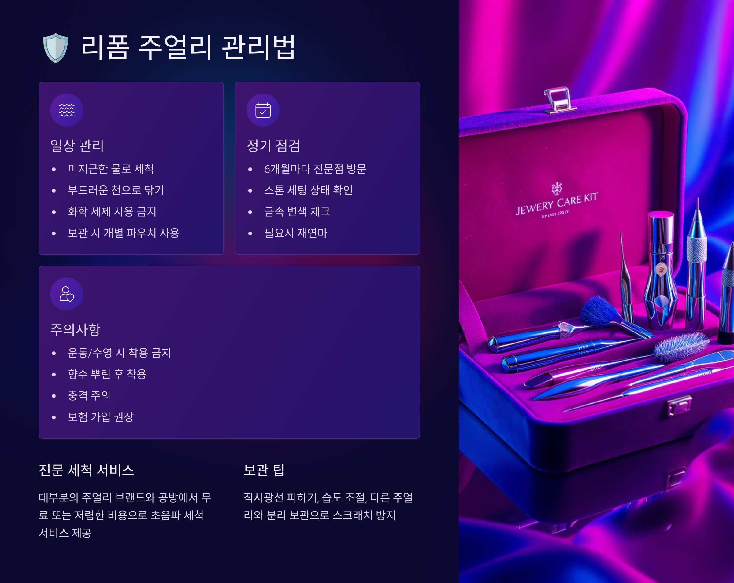 리폼된 주얼리는 새로운 생명을 얻은 만큼 특별한 관리가 필요해요. 우선 일상적인 관리법부터 알아볼까요? 리폼 주얼리는 착용 후 반드시 부드러운 천으로 닦아주는 것이 중요해요. 특히 리폼 과정에서 여러 종류의 금속이 결합된 경우, 각 소재별로 다른 관리법을 적용해야 한답니다. 예를 들어, 로즈골드와 화이트골드가 함께 사용된 제품은 각각의 특성에 맞는 전용 클리너를 사용해야 해요.