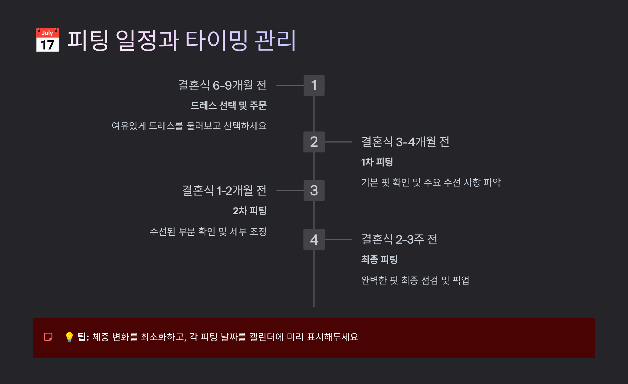 | 1주일 전 | 최종 피팅 | 당일 착용할 모든 것 | 드레스 수령 확인 |