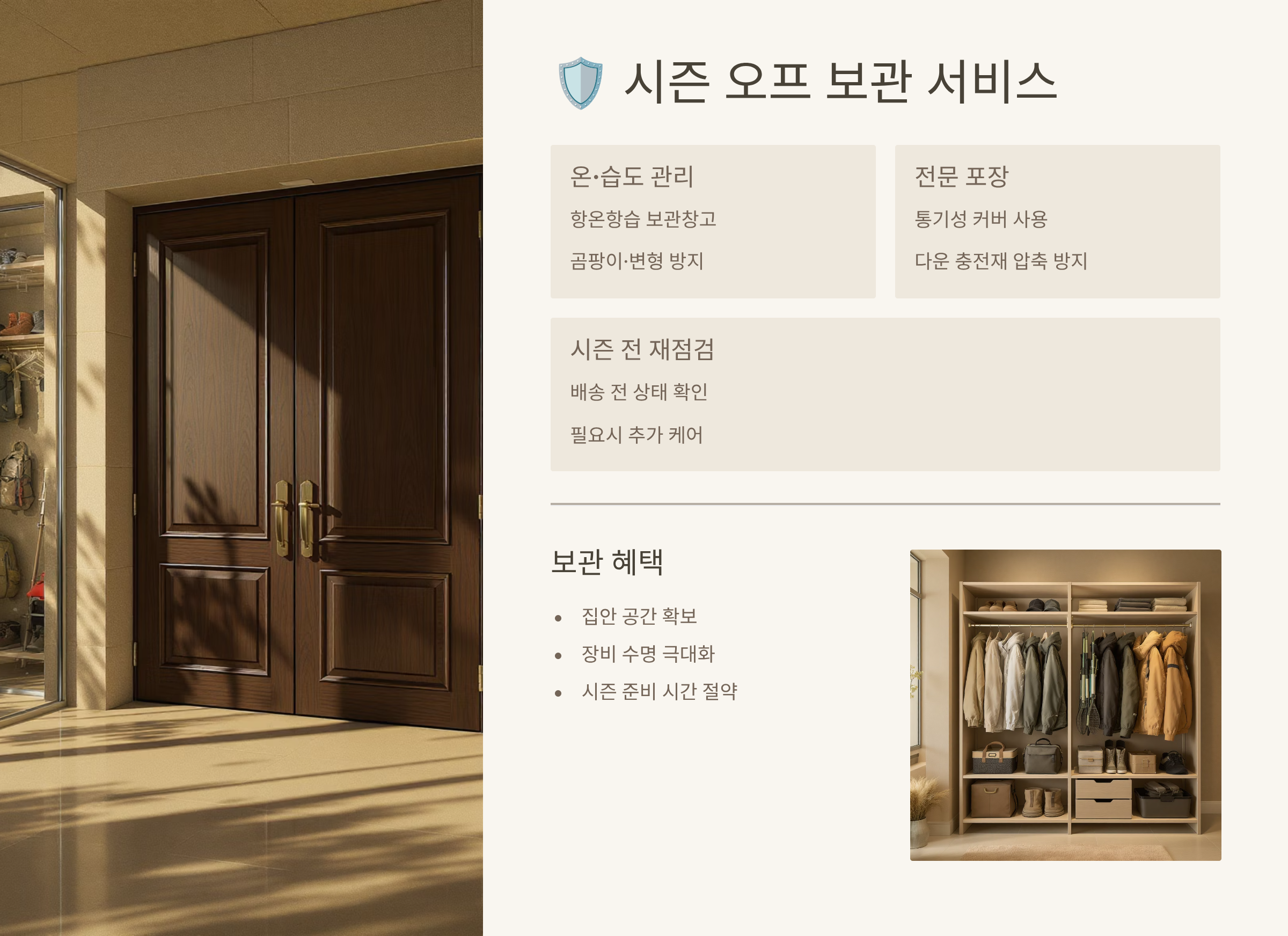 시즌 오프 보관 서비스는 고가의 아웃도어 제품을 최상의 상태로 유지하는 핵심이에요. 여름에 겨울 다운을 보관할 때 압축하면 안 되는 거 아시나요? 다운의 로프트가 망가져서 보온성이 떨어진답니다. 전문 보관 서비스는 온도 22도, 습도 50%의 최적 환경에서 행거에 걸어 보관해요. 통풍도 잘 되고 직사광선도 차단해서 제품 수명이 2배 이상 늘어난답니다.