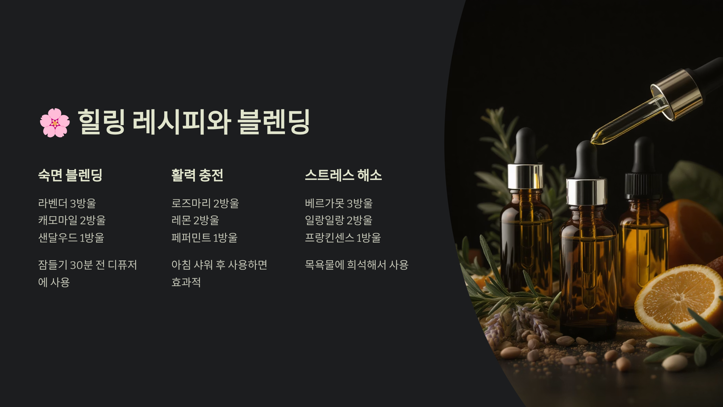 목적별 특별 레시피도 있어요. 로맨틱한 분위기를 위한 '센슈얼 블렌드'는 일랑일랑 3방울, 재스민 2방울, 샌달우드 3방울, 바닐라 1방울로 만들어요. 집중력 향상을 위한 '포커스 블렌드'는 로즈메리 4방울, 페퍼민트 3방울, 레몬 3방울이 효과적이에요. 깊은 수면을 위한 '드림 블렌드'는 라벤더 5방울, 캐모마일 3방울, 베티버 2방울로 편안한 밤을 만들어줘요. 면역력 강화를 위한 '이뮨 부스트'는 티트리 3방울, 유칼립투스 3방울, 레몬 4방울이 좋답니다.