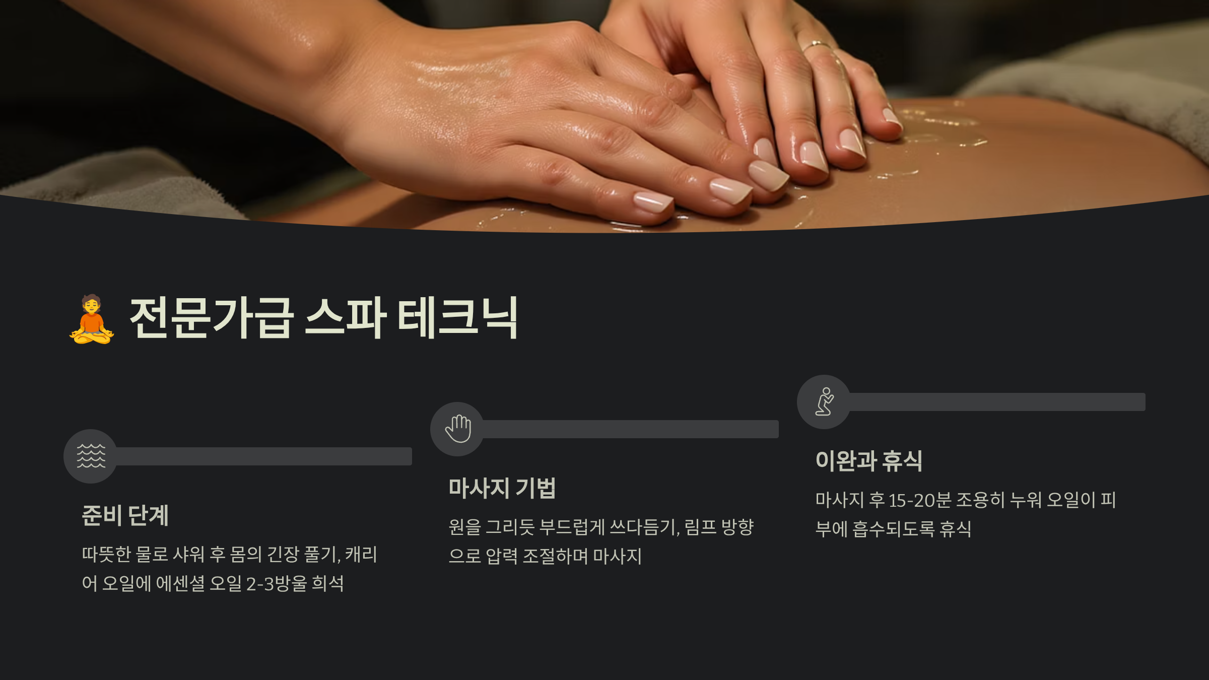 아로마 홈스파는 단순한 사치가 아닌, 현대인의 필수 셀프케어 루틴이에요. 바쁜 일상 속에서도 집에서 간편하게 5성급 스파의 럭셔리를 경험하며, 몸과 마음의 완벽한 밸런스를 찾을 수 있답니다. 천연 에센셜 오일의 치유력으로 스트레스는 날려버리고, 활력과 아름다움은 충전하세요. 오늘부터 당신의 집을 힐링 성소로 만들어보는 건 어떨까요? 🌿✨