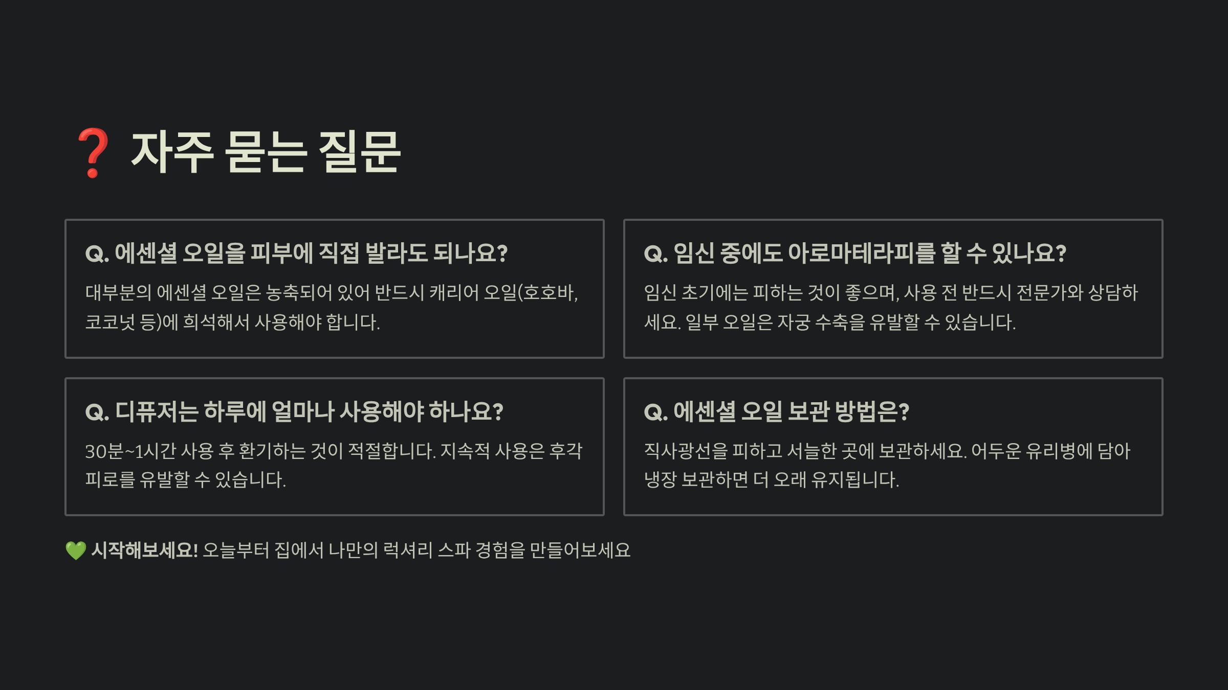 A1. 기본적인 아로마 홈스파는 5-10만 원 정도로 시작할 수 있어요. 필수 에센셜 오일 3-4종(라벤더, 티트리, 유칼립투스, 페퍼민트), 캐리어 오일 1종, 디퓨저나 오일 버너 하나면 충분해요. 점차 컬렉션을 늘려가면서 업그레이드하시면 됩니다.