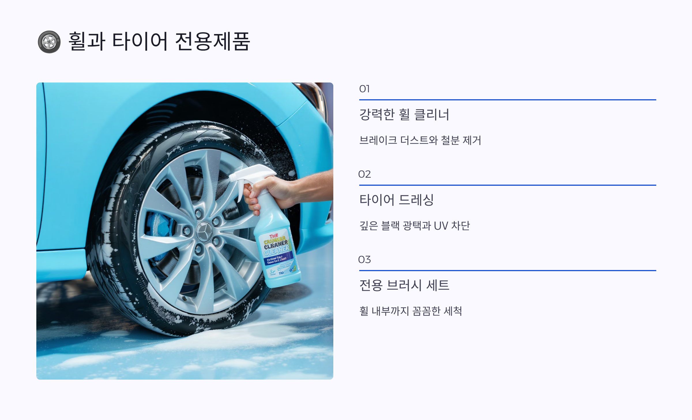 휠과 타이어는 차량의 첫인상을 좌우하는 중요한 부분이에요. 아무리 차체가 깨끗해도 휠이 더럽거나 타이어가 퇴색되어 있으면 전체적인 인상이 지저분해 보여요. 전용 제품을 사용하면 새것처럼 관리할 수 있답니다.