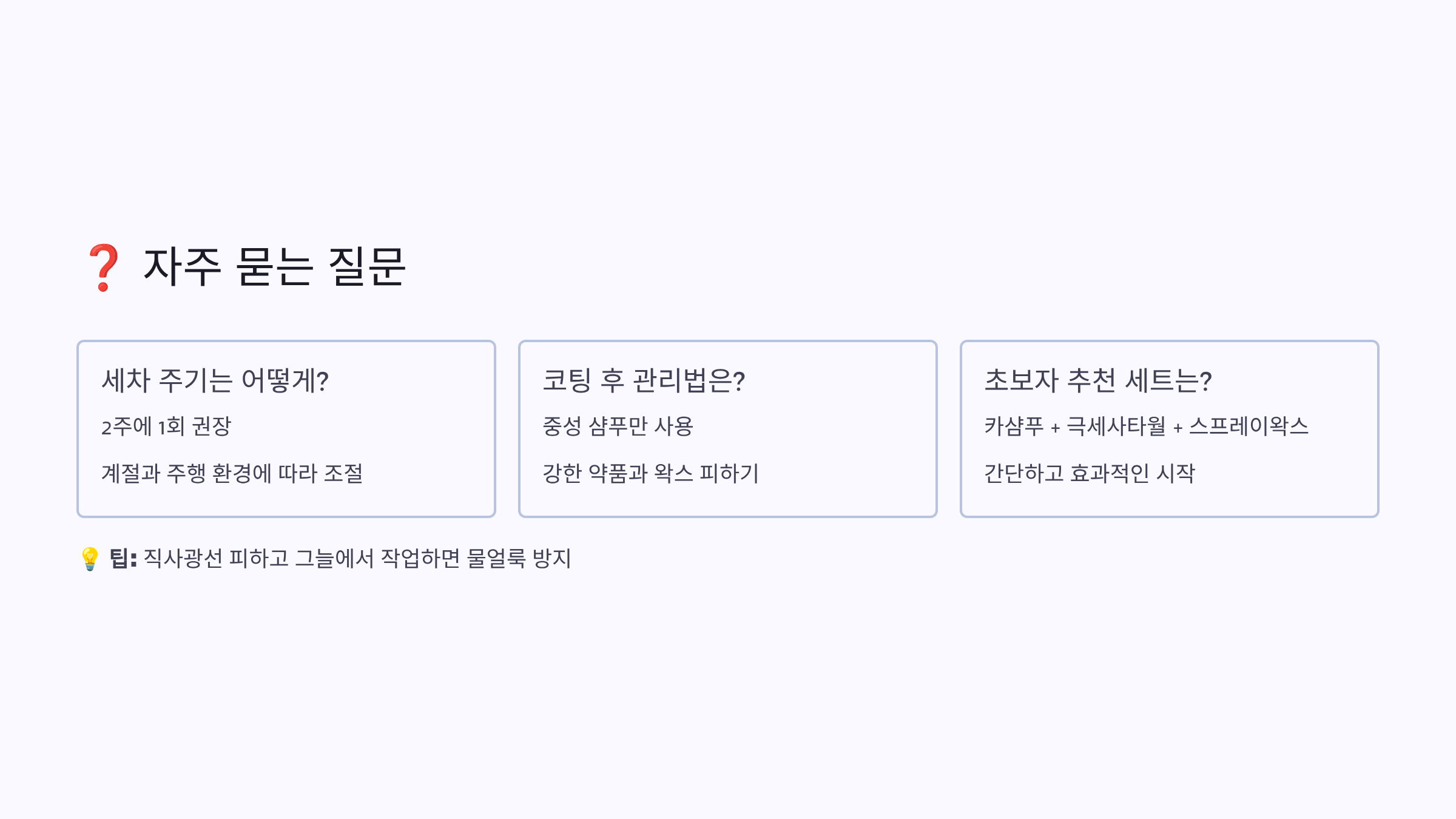 A7. 일반적으로 3개월에 1회가 적당해요. 고속도로를 자주 이용하거나 공업지역 근처라면 2개월에 1회로 늘리세요. 너무 자주 사용하면 코팅이나 왁스가 제거될 수 있으니 주의해야 해요. 흰색 차량은 황변이 보이면 바로 사용하세요.
