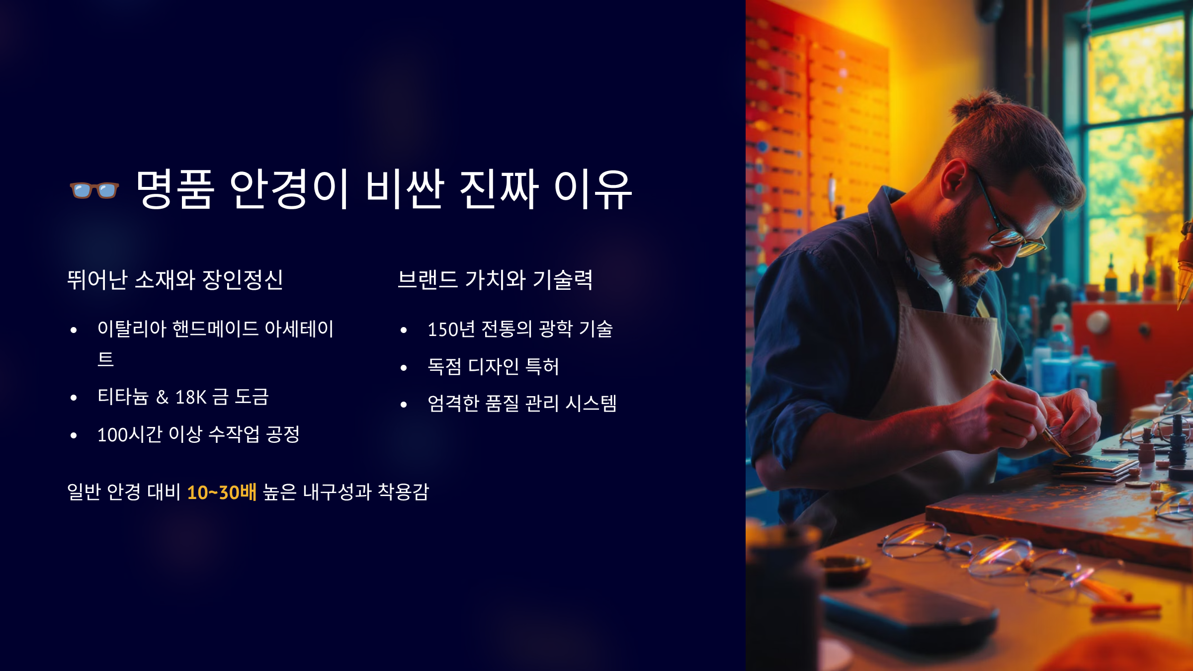 명품 안경이 왜 그렇게 비싼지 궁금하셨죠? 단순히 브랜드 값만 있는 게 아니에요. 먼저 소재부터 남달라요. 티타늄, 아세테이트, 버펄로 뿔 같은 최고급 소재를 사용하는데, 이런 소재들은 가볍고 내구성이 뛰어나면서도 알레르기 반응이 거의 없어요. 특히 일본산 티타늄은 항공기에 쓰이는 소재와 같은 등급이라고 하네요.