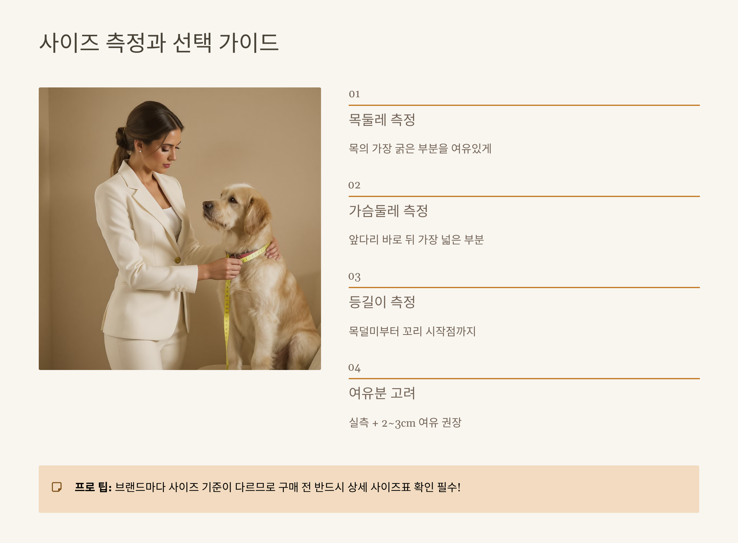 정확한 사이즈 측정은 럭셔리 펫 패션의 시작이에요. 먼저 목둘레는 목과 어깨가 만나는 지점에서 측정하되, 손가락 두 개가 들어갈 정도의 여유를 두세요. 가슴둘레는 앞다리 바로 뒤쪽의 가장 넓은 부분을 측정하면 되는데, 숨을 쉴 때의 변화를 고려해서 2-3cm 여유를 주는 것이 좋아요.