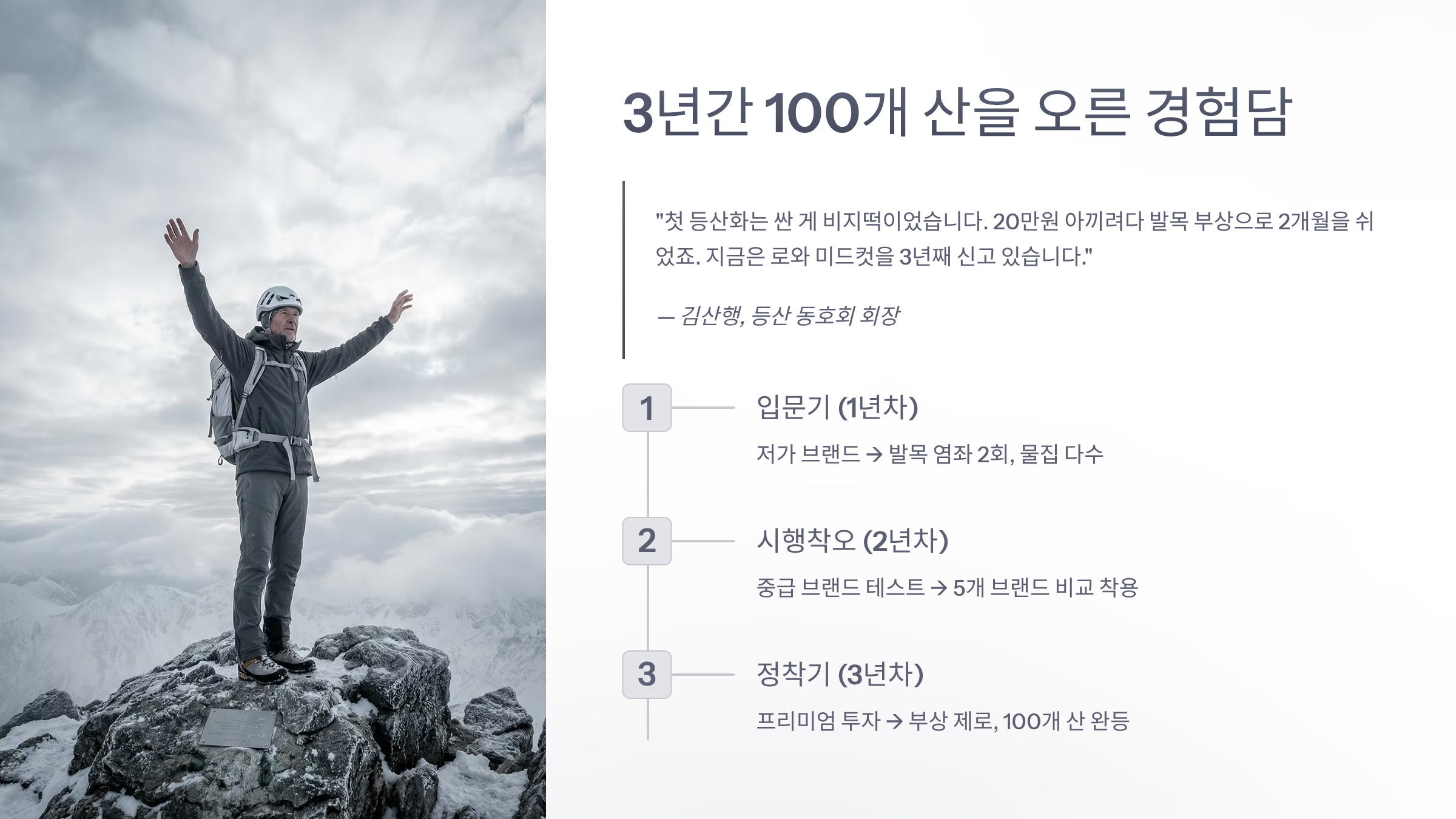 동호회 활동을 하며 다양한 사람들을 만났는데, 70대 어르신이 "좋은 신발은 병원비를 아껴준다"라고 하신 말이 인상 깊었어요. 실제로 그분은 40년간 등산을 하시면서 한 번도 큰 부상을 당한 적이 없다고 하셨죠. 항상 최고급 신발을 신으시는 이유였어요.