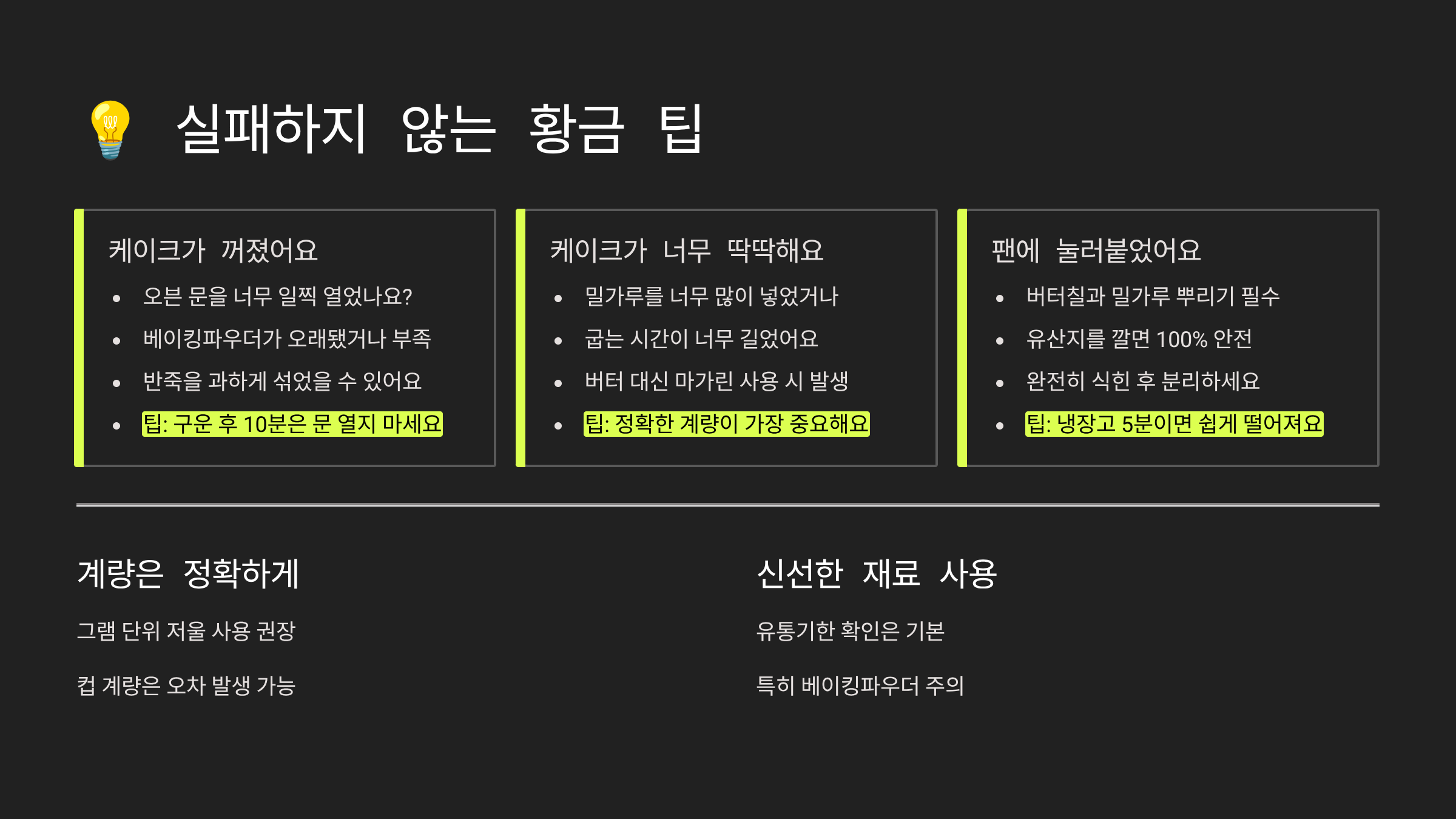 각 레시피마다 포인트가 있어요. 스펀지케이크는 달걀 거품을 충분히 내는 게 중요하고, 치즈케이크는 과도하게 섞지 않는 게 포인트예요. 당근 케이크는 당근의 수분을 잘 짜주는 게 중요해요.
