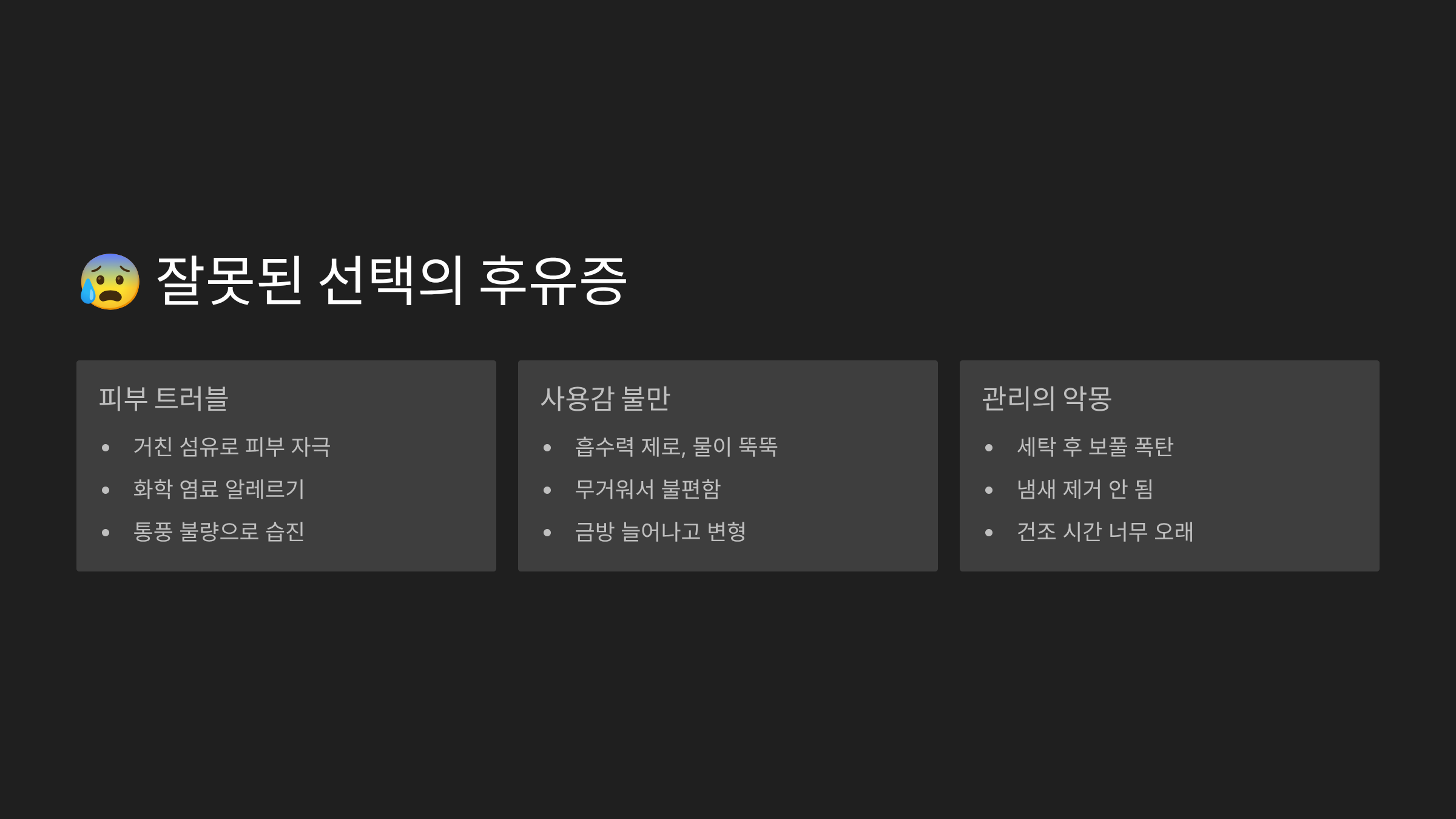 | 낮은 흡수력 | 물기가 남아 축축함 | 면 80% 이상 제품 선택 |
