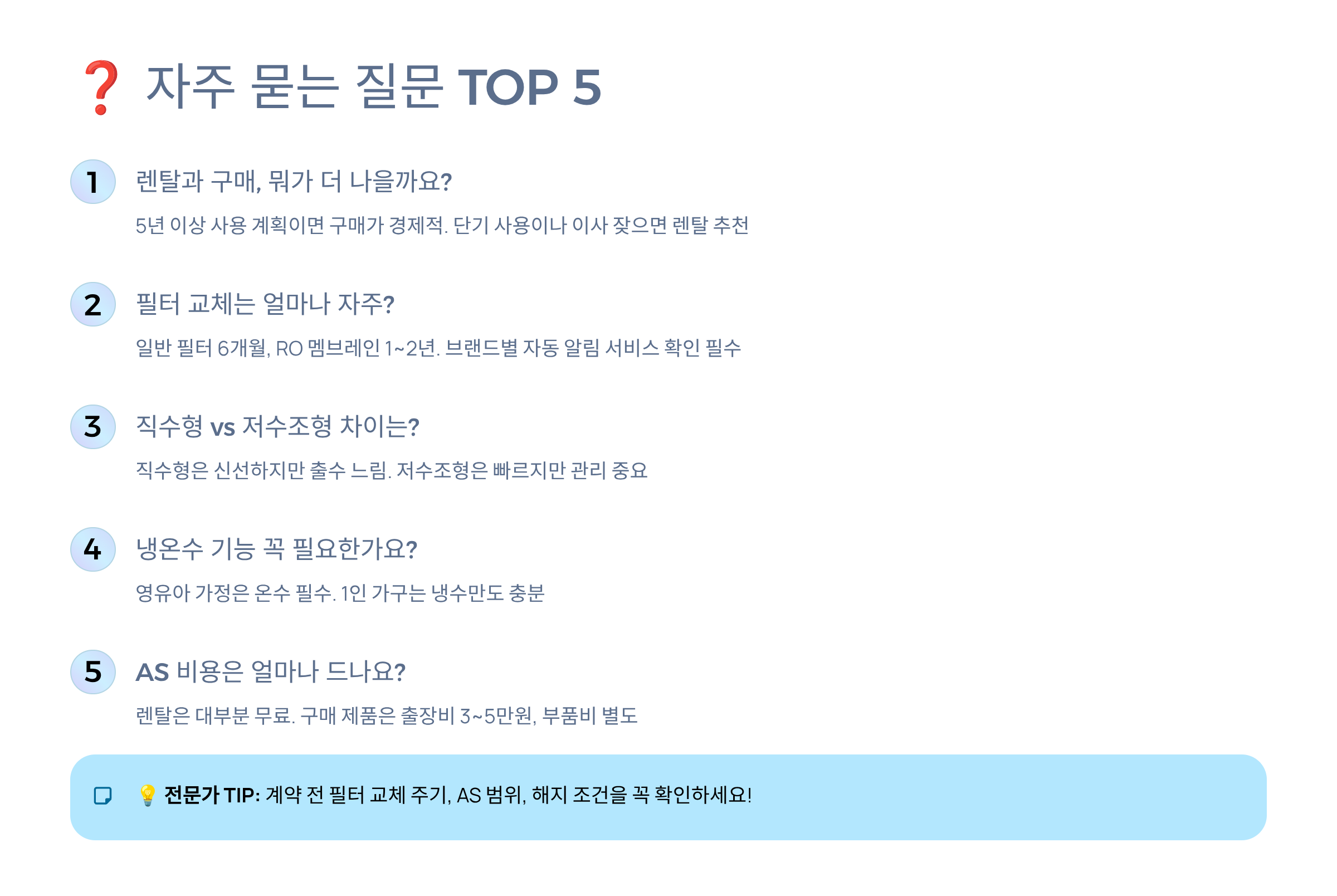 본 콘텐츠는 정보 제공 목적으로 작성되었으며, 특정 제품이나 브랜드를 추천하거나 광고하는 것이 아닙니다. 정수기 선택 및 구매에 관한 최종 결정은 전문가 상담 및 개인의 판단에 따라 이루어져야 합니다. 본 글에 포함된 가격, 성능, 서비스 정보는 작성 시점 기준이며 실제와 다를 수 있습니다. 정확한 정보는 해당 제조사 또는 판매처에 직접 확인하시기 바랍니다.