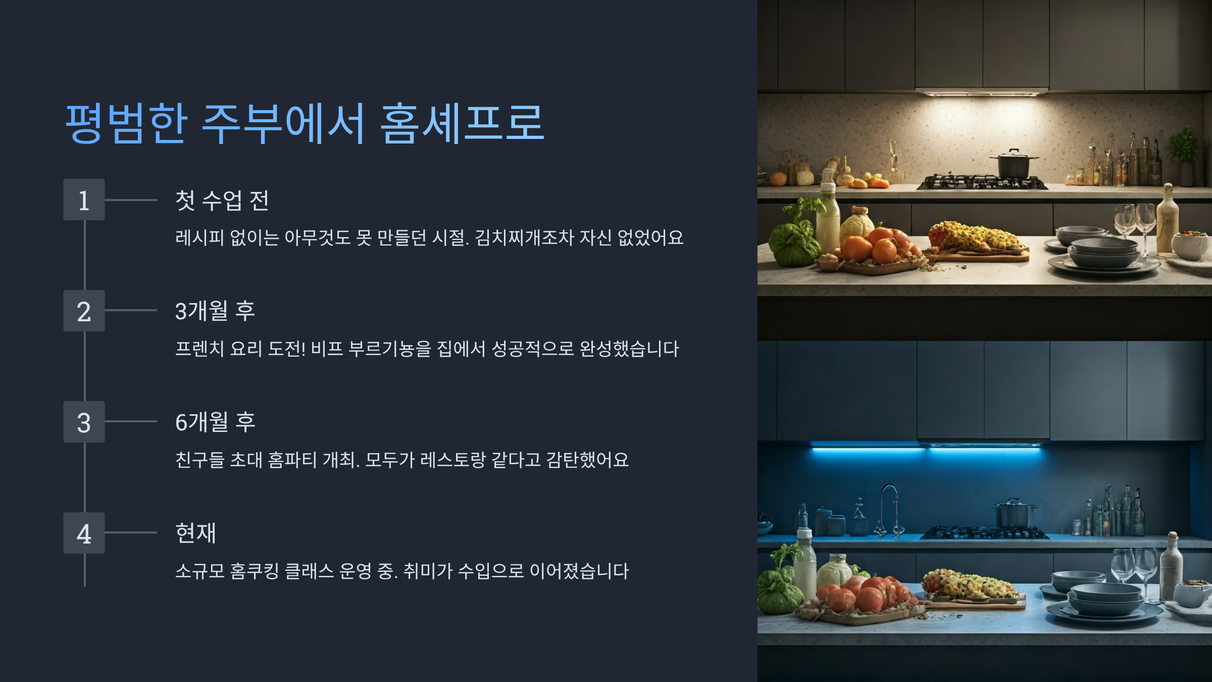 신혼부부인 최민서 씨(29세)는 요리를 전혀 못했는데 남편을 위해 클래스에 등록했어요. 6개월 후 남편 생일에 풀코스 디너를 직접 만들어 깜짝 이벤트를 했는데 남편이 감동해서 눈물을 흘렸대요. 레스토랑 부럽지 않은 집밥 덕분에 신혼 생활이 더 달콤해졌답니다.