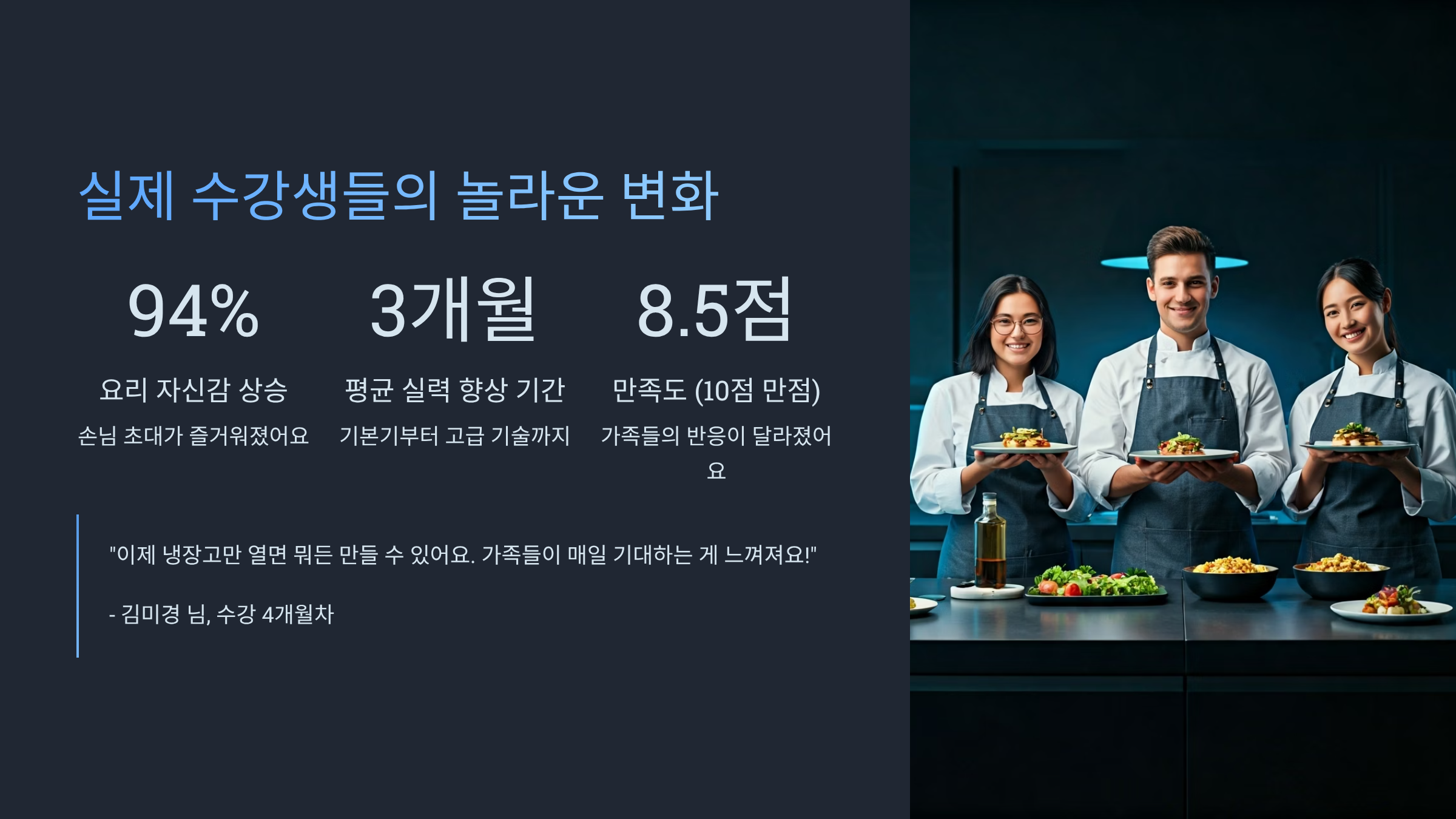 고급 요리 클래스 수강 후 놀라운 변화를 경험한 수강생이 1만 명을 돌파했어요.