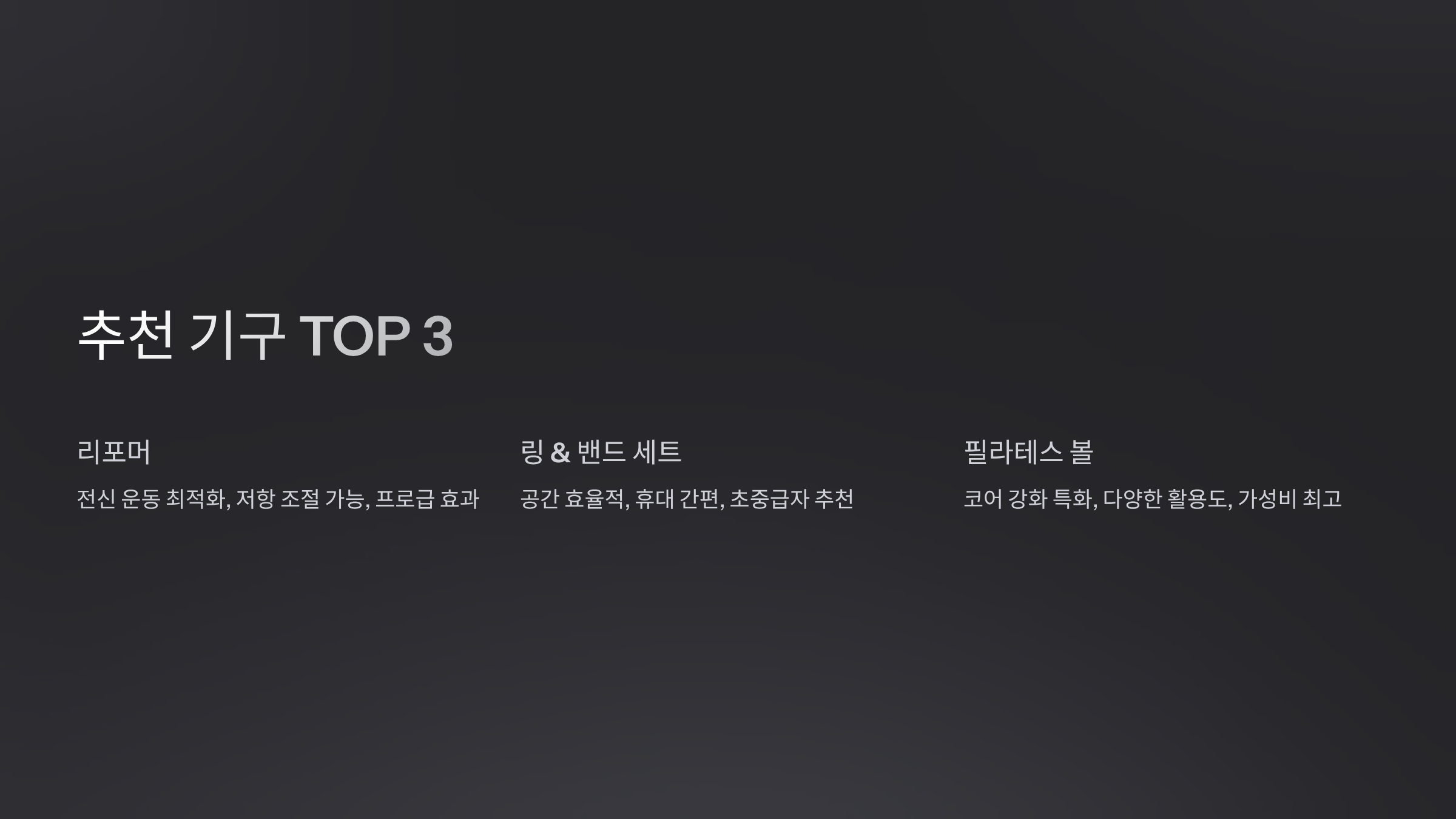 A1. 리포머가 가장 추천돼요. 전신 운동이 가능하고 동작 종류가 다양해서 초보자부터 숙련자까지 활용도가 높답니다.