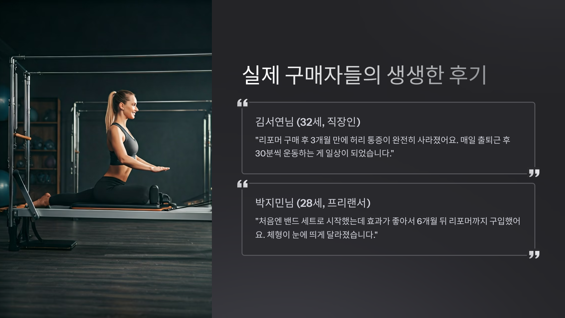 | 한소라(29세) | 체중 감량 | 접이식 리포머 | 8kg 감량 |