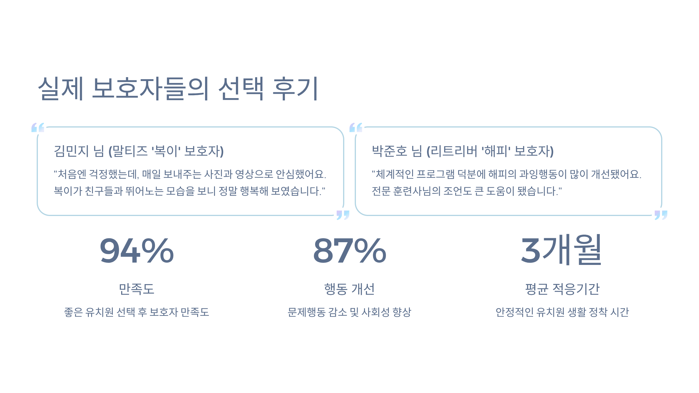 보호자의 죄책감과 스트레스도 큰 문제예요. 잘못된 선택으로 우리 아이가 고통받았다는 생각에 오랫동안 괴로워하는 분들이 많아요. 이런 상황을 예방하려면 처음 선택할 때 충분한 시간을 투자해야 해요.