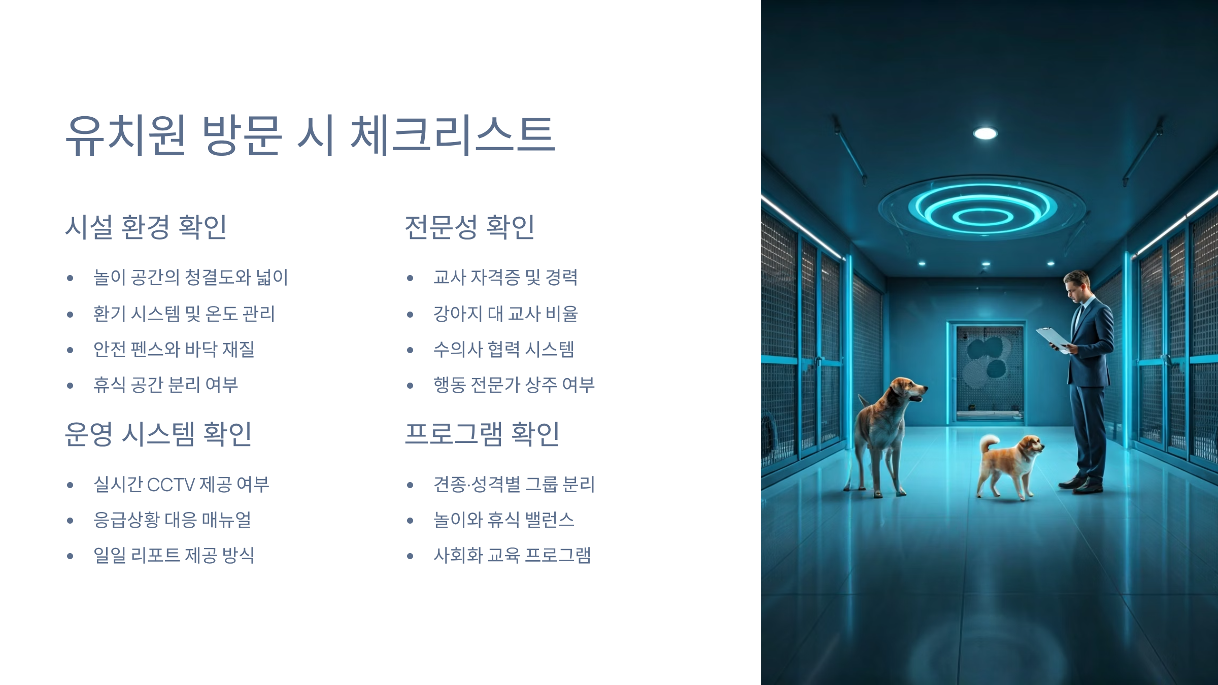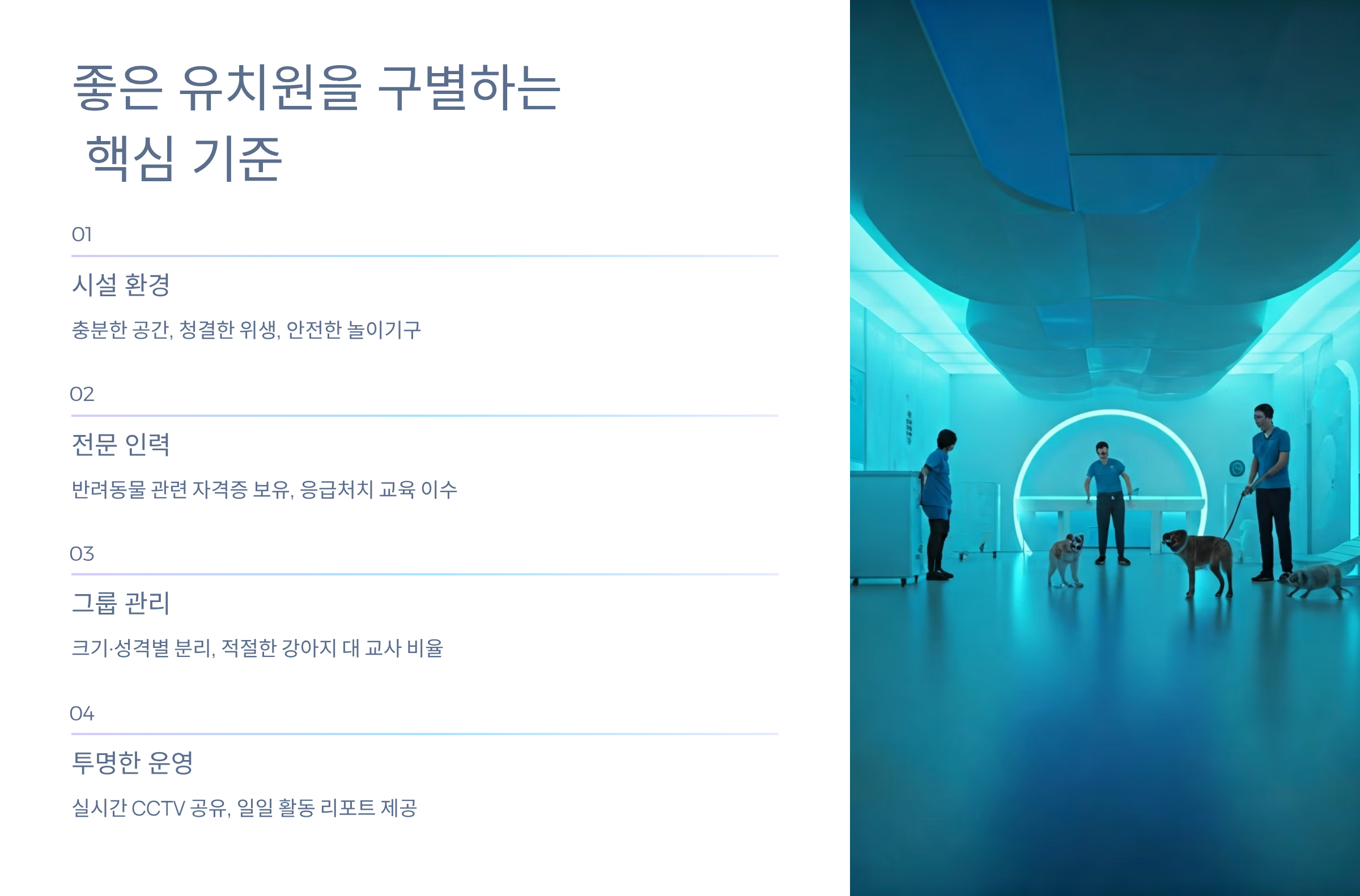좋은 반려동물 유치원을 선택하는 첫 번째 기준은 투명성이에요. 운영 방식, 하루 일과, 관리 인력 수, 응급 상황 대처 매뉴얼 등을 명확하게 공개하는 곳이 신뢰할 수 있어요. 질문에 대해 회피하거나 모호하게 답하는 곳은 피하는 게 좋아요.