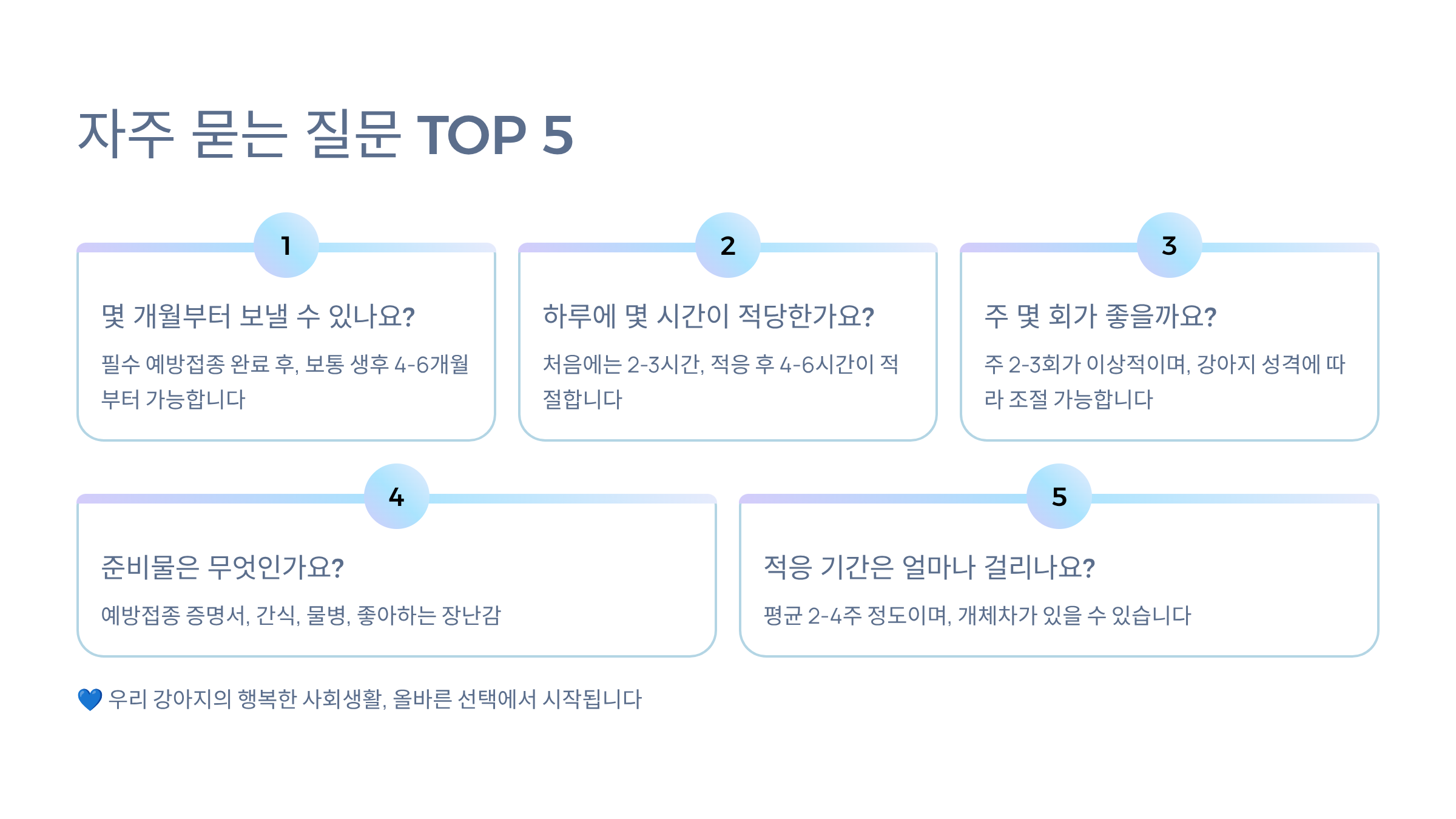 | 전문 시설형 | 30마리 이상 전용 시설 | 다양한 프로그램 | 개별 관심 부족 가능 |