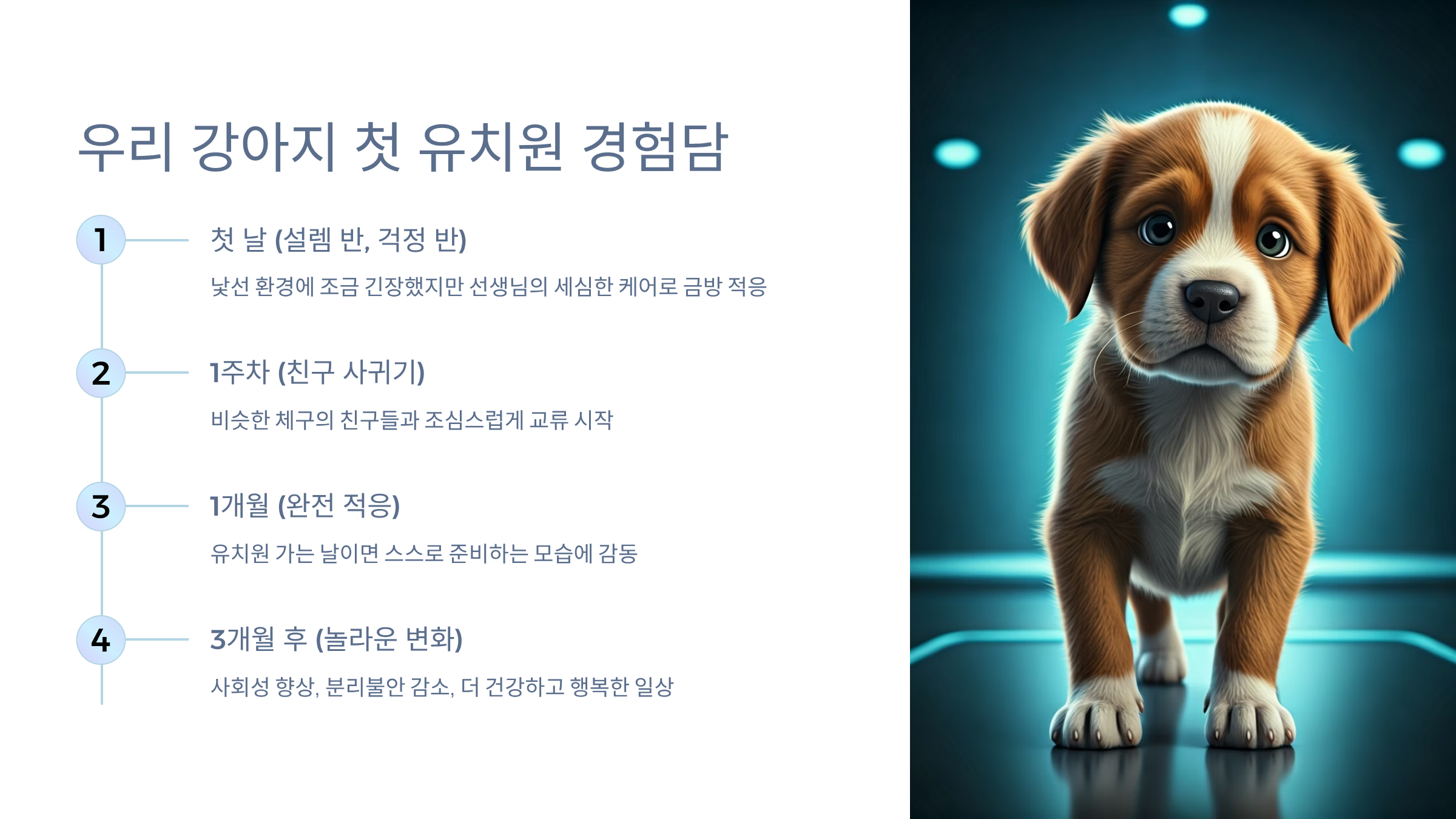 미국수의사협회(AVMA)의 연구에 따르면 어린 시절 긍정적인 사회화 경험을 한 반려견은 성견이 되어서도 분리불안이나 공격성 문제를 보일 확률이 65% 이상 낮다고 해요. 이처럼 유치원 선택은 우리 아이의 평생 행복에 영향을 미치는 중요한 결정이에요.