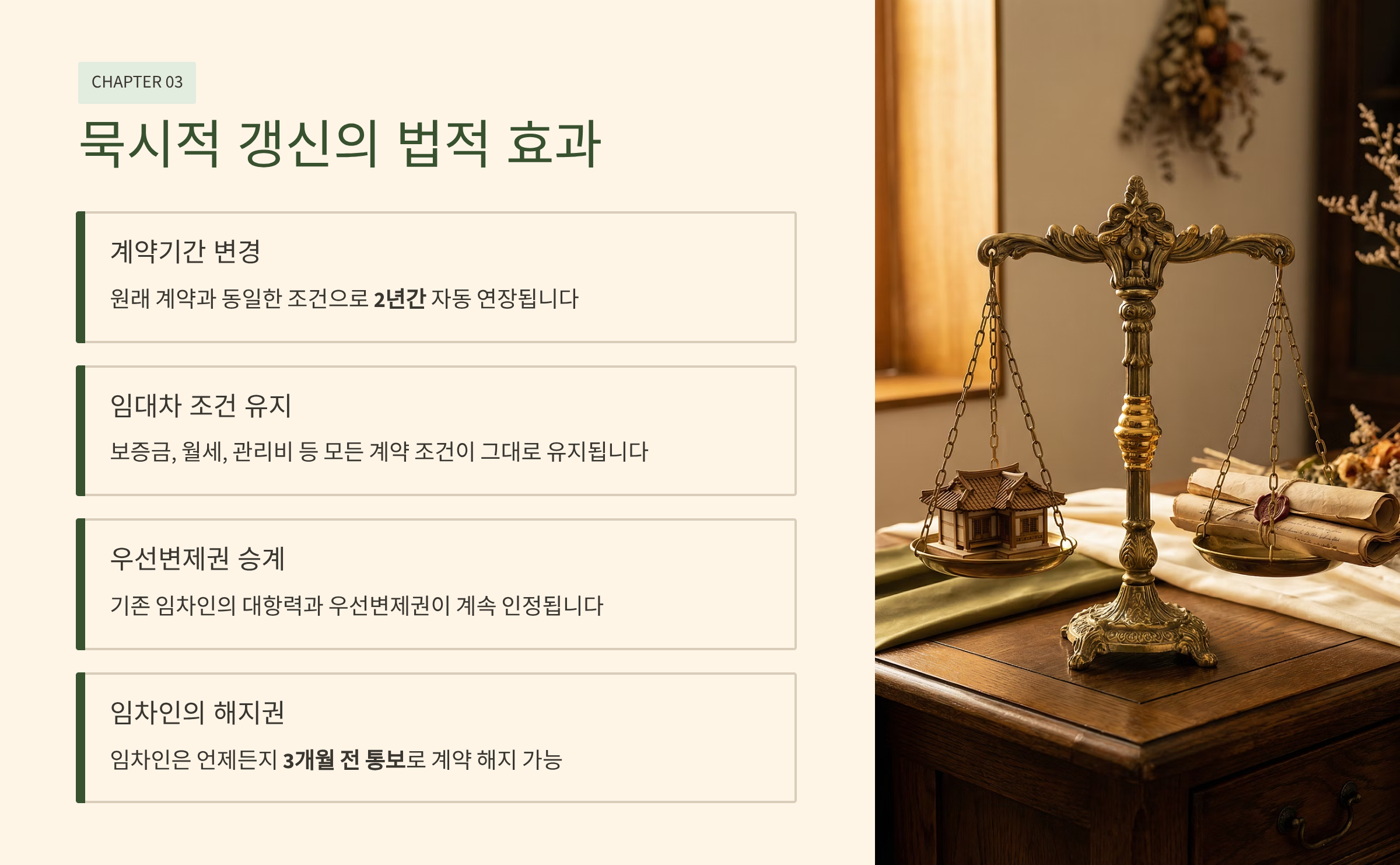 묵시적 갱신이 성립하면 임대차의 존속 기간은 2년으로 간주돼요. 다만 임차인에게는 특별한 권리가 부여되는데, 바로 언제든지 계약을 해지할 수 있는 권리예요. 반면 임대인은 이러한 해지권이 없기 때문에 묵시적 갱신이 되면 임대인 입장에서는 다소 불리한 상황이 될 수 있어요. 그래서 임대인 분들은 갱신 거절 통지 기간을 반드시 지켜야 해요.